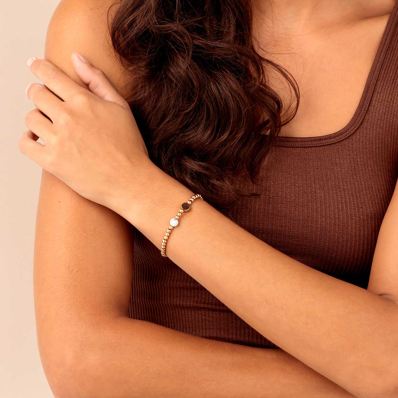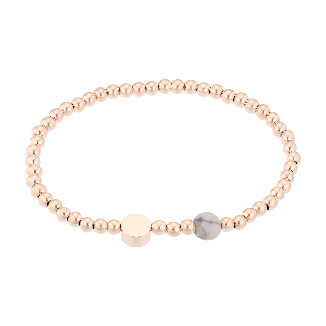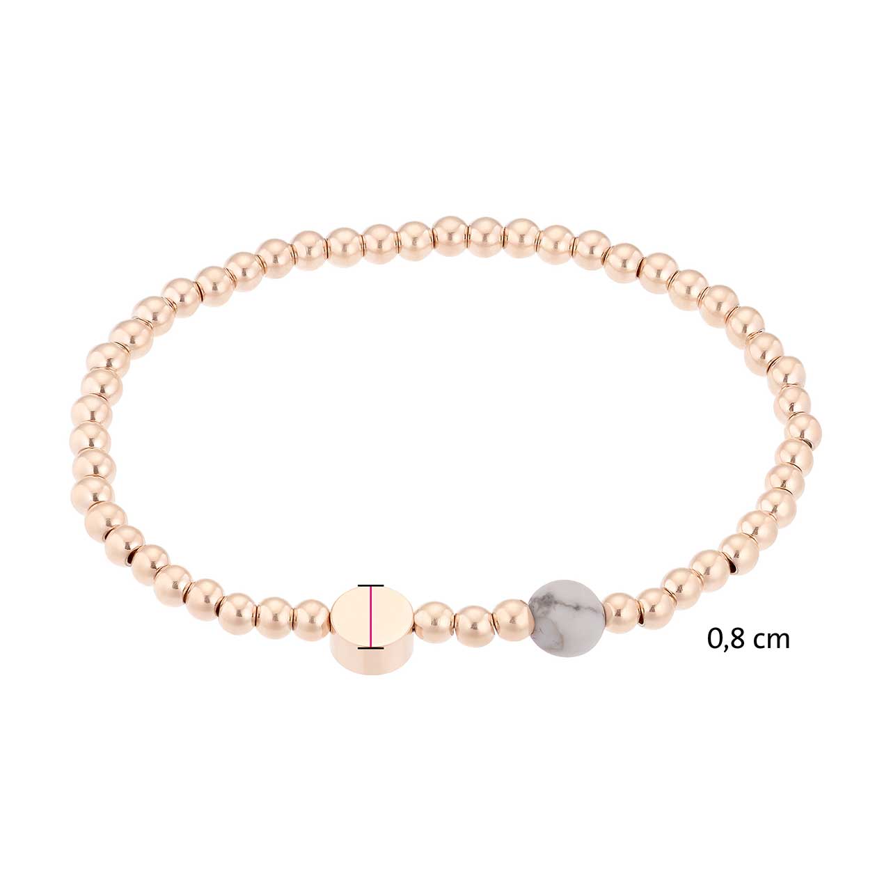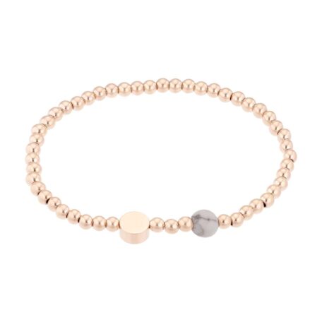 Această brățară flexibilă este realizată din mărgele din oțel inoxidabil în nuanțe delicate de aur roz. Elementul cilindric magnetic și piatra de turcoaz alb, care creează un contrast frumos cu tonurile de roz, sunt de-a dreptul remarcabile și conferă bijuteriei acel ceva special.
