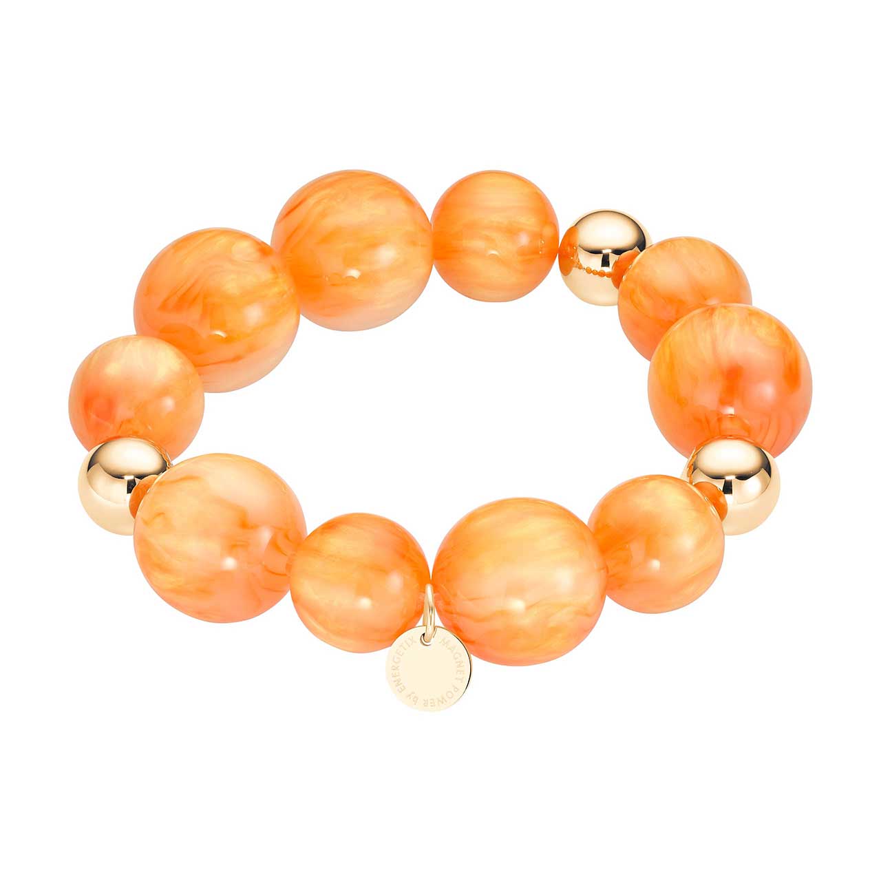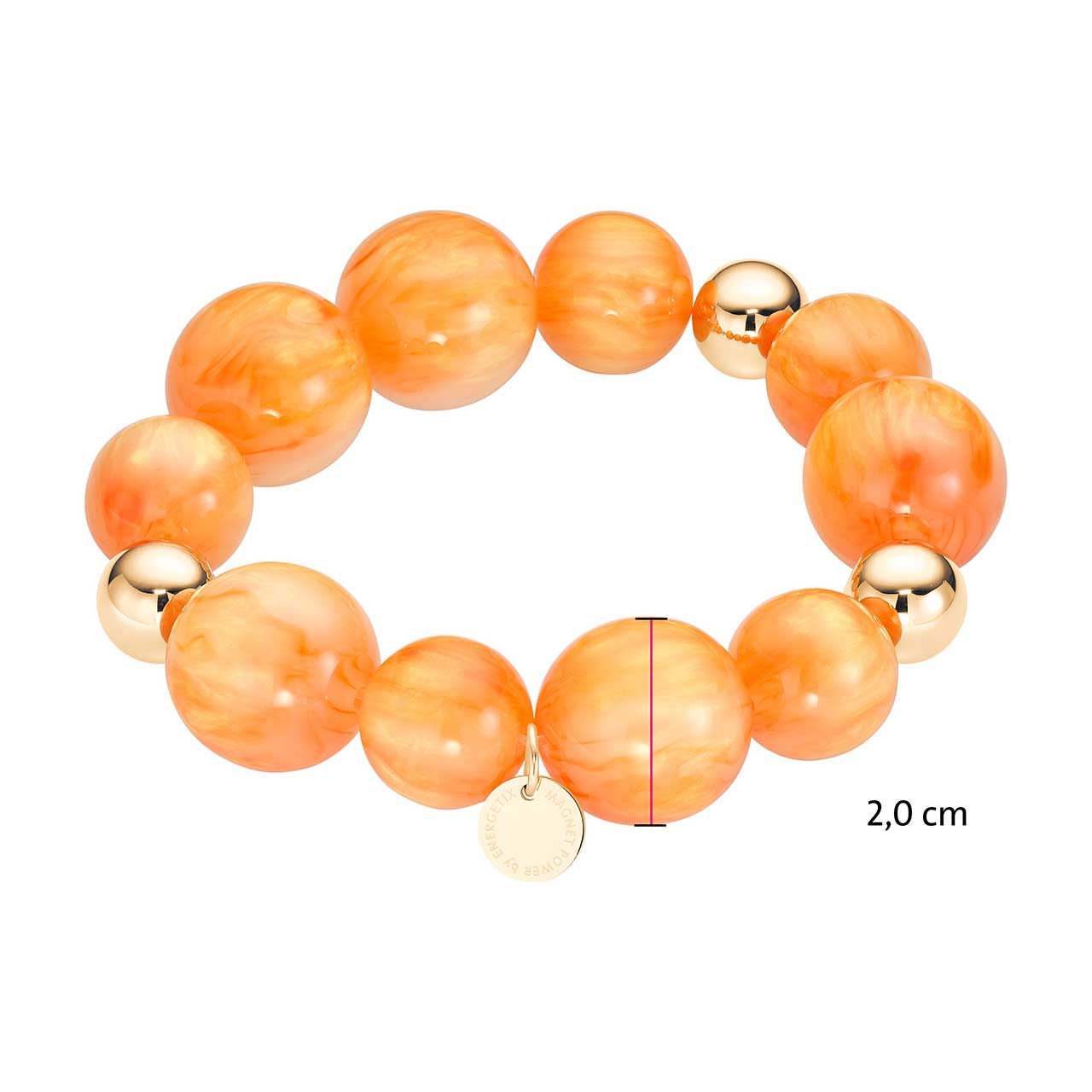Această brățară se compune din mărgele de rășină de înaltă calitate care acoperă întregul spectru de culori, de la caisă pal până la portocaliu intens. Mărgelele au un ușor efect iridescent care se armonizează frumos cu micile sfere din oțel inoxidabil placate cu aur. Bijuteria este ușor de pus pe încheietura mâinii, se potrivește perfect și atrage privirile ca şi accesoriu statement.