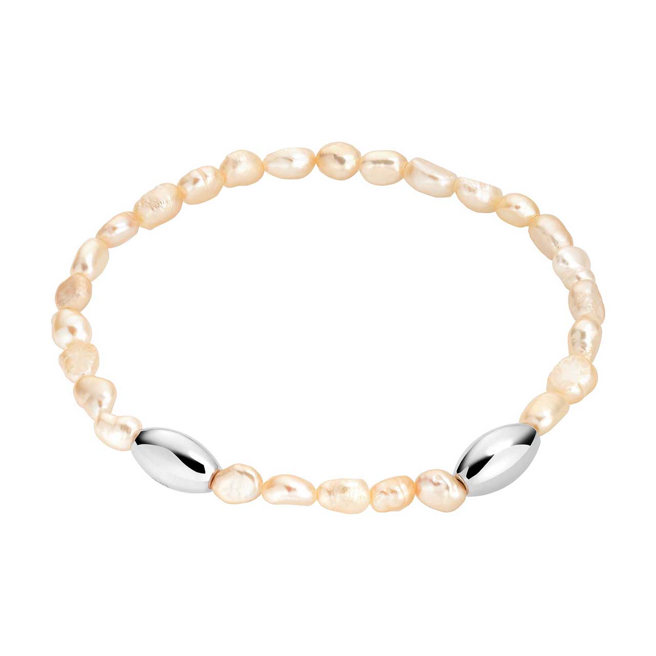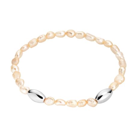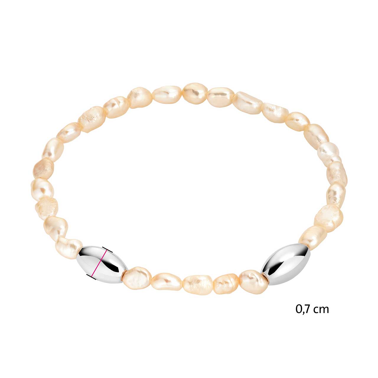 Această brățara flexibilă este realizată din perle veritabile de apă dulce, ceea ce înseamnă că fiecare perlă este unică. Bijuteria strălucește subtil în tonuri de caisă, care sunt atât moderne, dar şi clasice și se pot combina minunat. Cele două elemente magnetice din oțel inoxidabil foarte lucios ies în evidență din rândul de perle, completând cu succes designul.