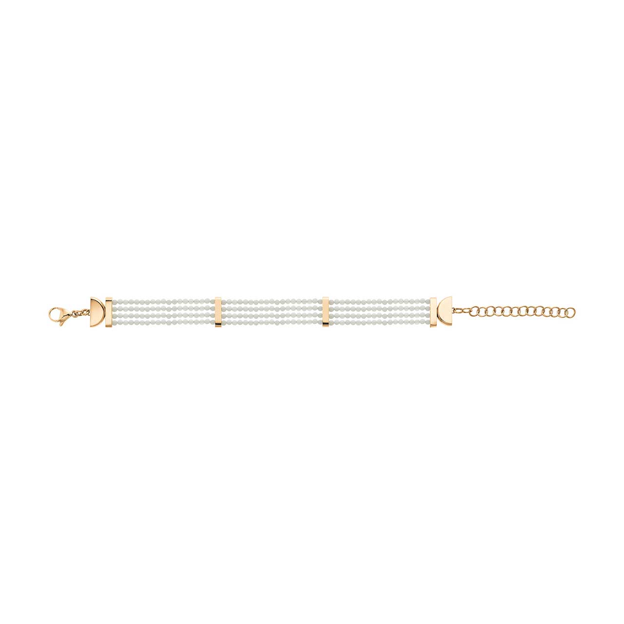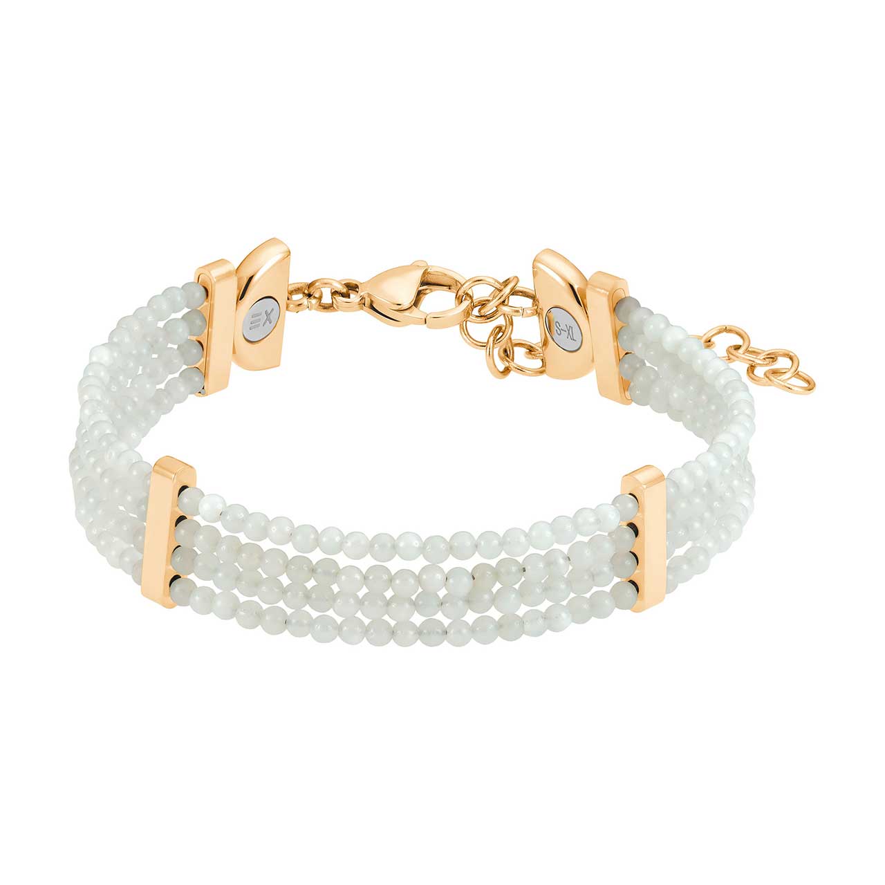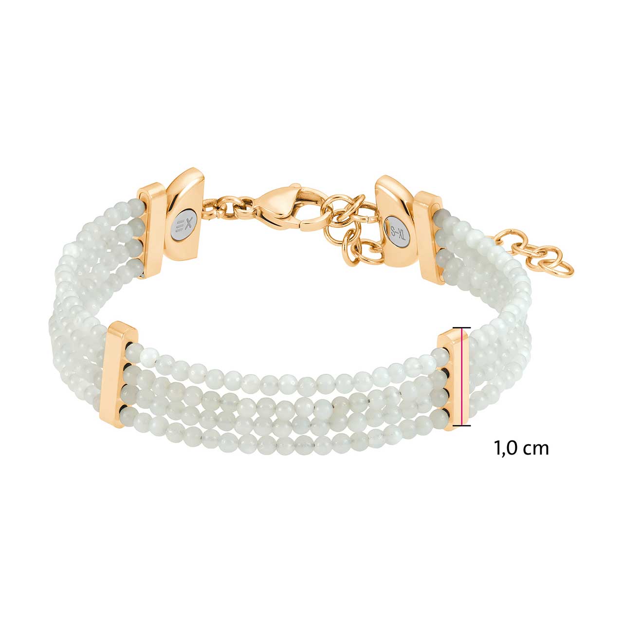 O brățară magnetică fină, cu mai multe rânduri, din oțel inoxidabil placat cu aur și mărgele mici de jad alb murdar. Această interpretare modernă a unei brățări clasice este perfectă pentru femeile care apreciază combinația dintre frumusețea naturală și designul sofisticat.