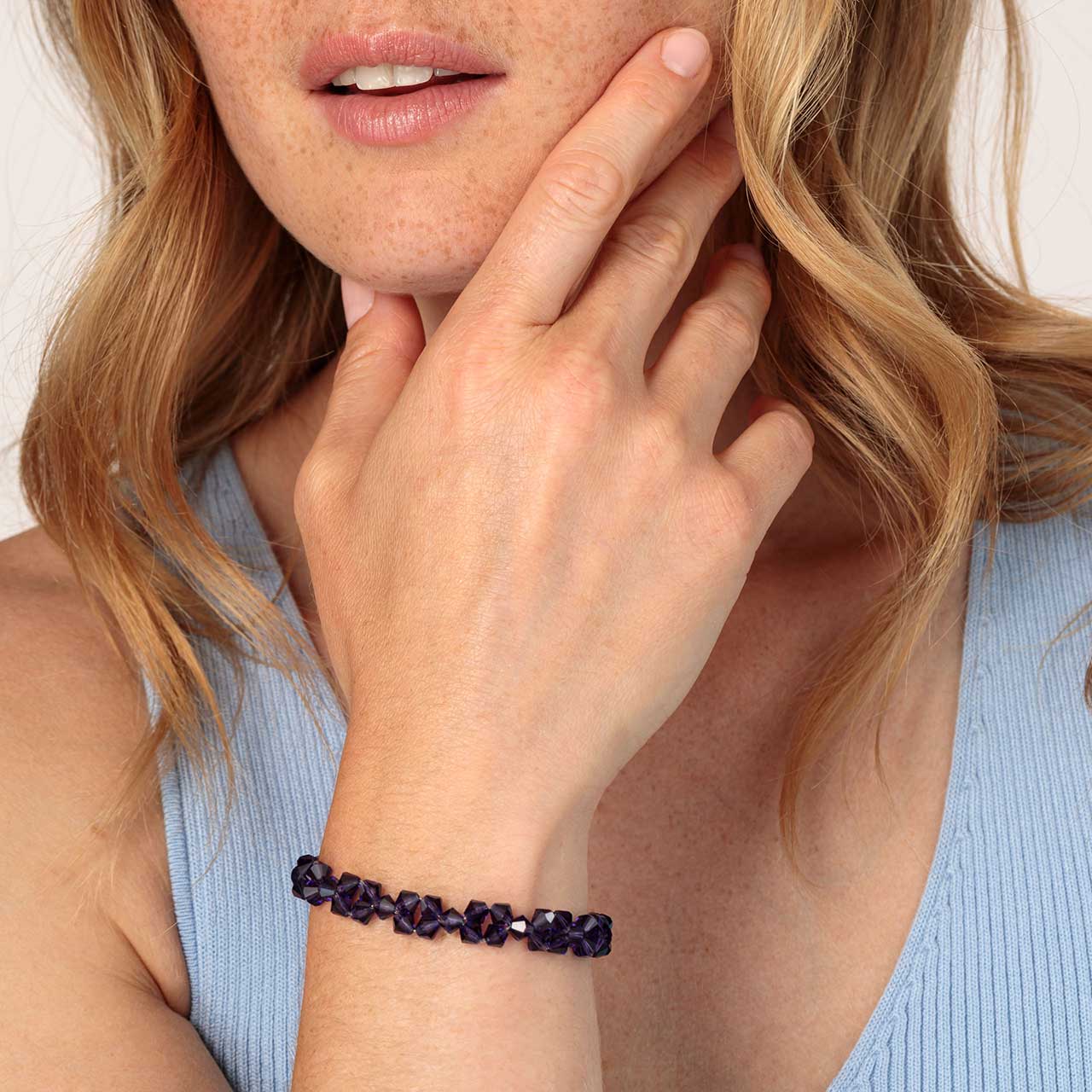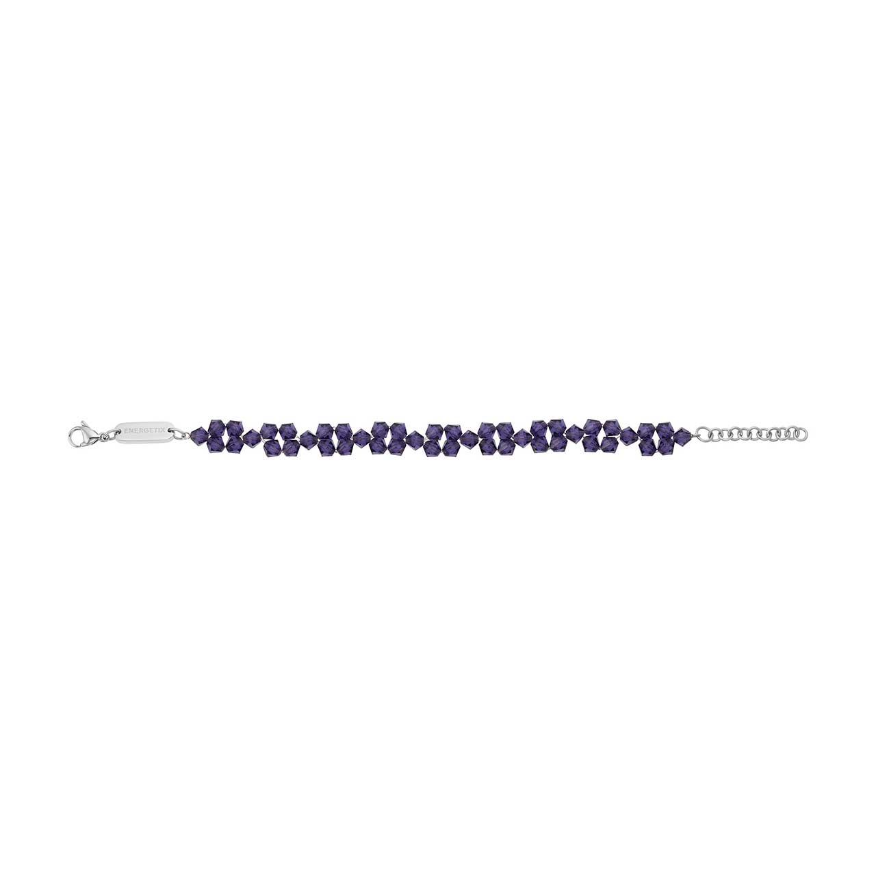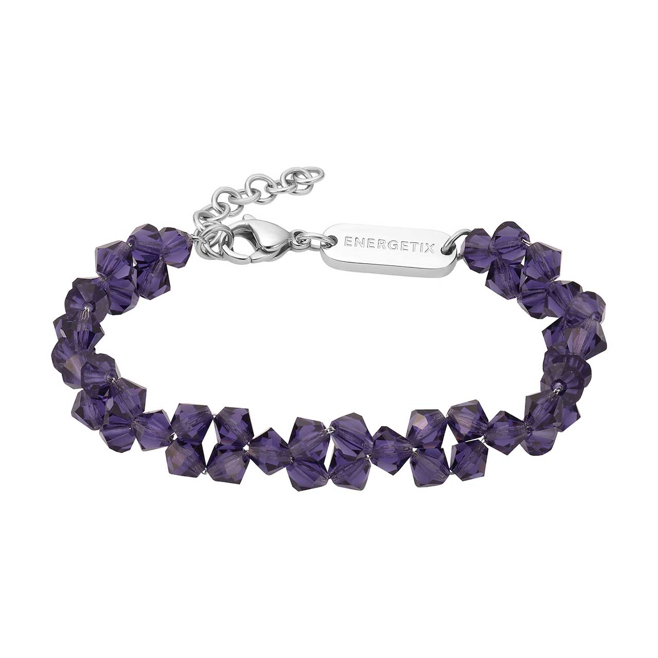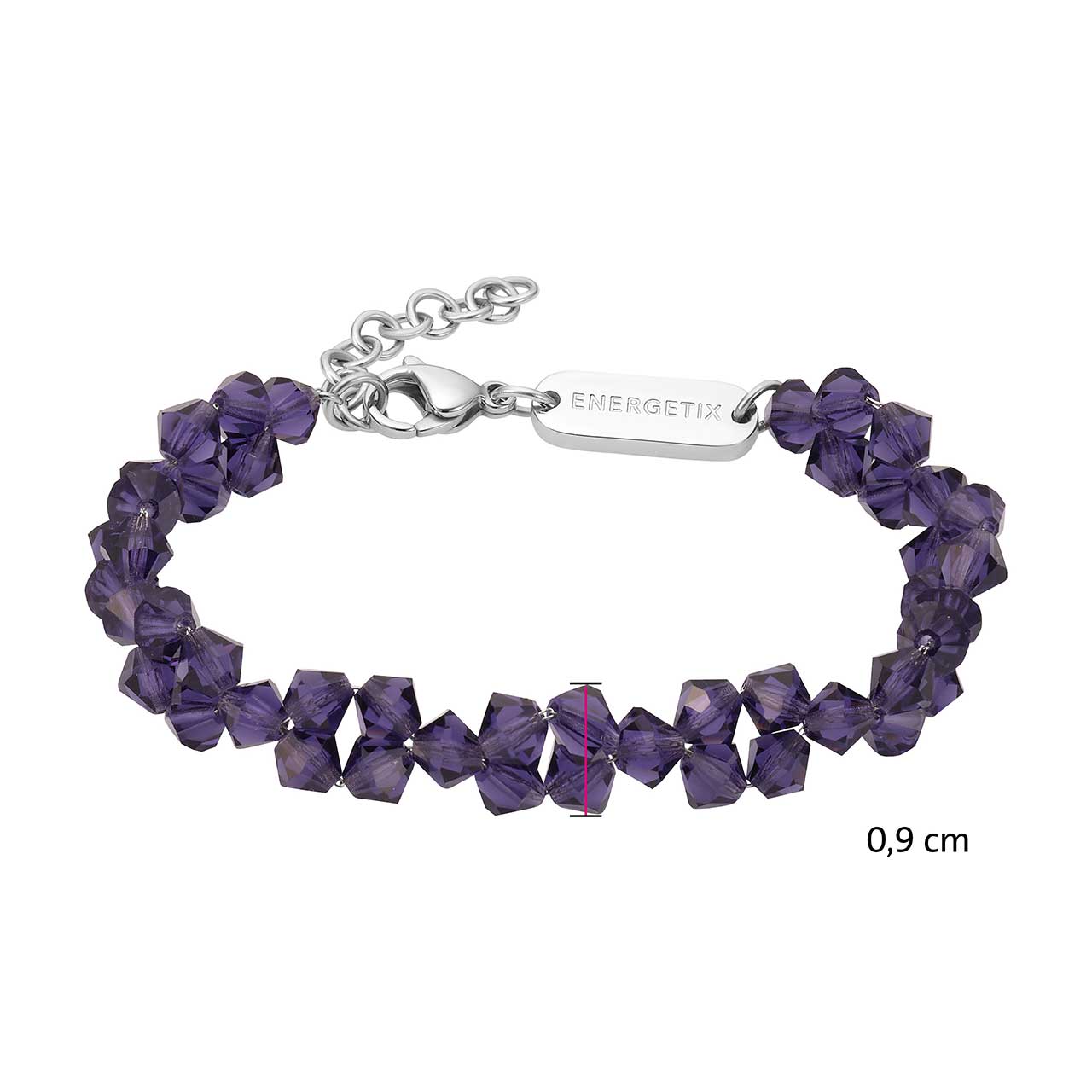 O brățară strălucitoare, realizată din mărgele fațetate, de culoare albastru-violet închis. Brățara constă numai din mărgele, care formează un model frumos în jurul brațului. Un accesoriu feeric pentru femeile care iubesc detaliile elegante. Mărimea poate fi ajustată individual datorită unui lanț de extensie integrat.