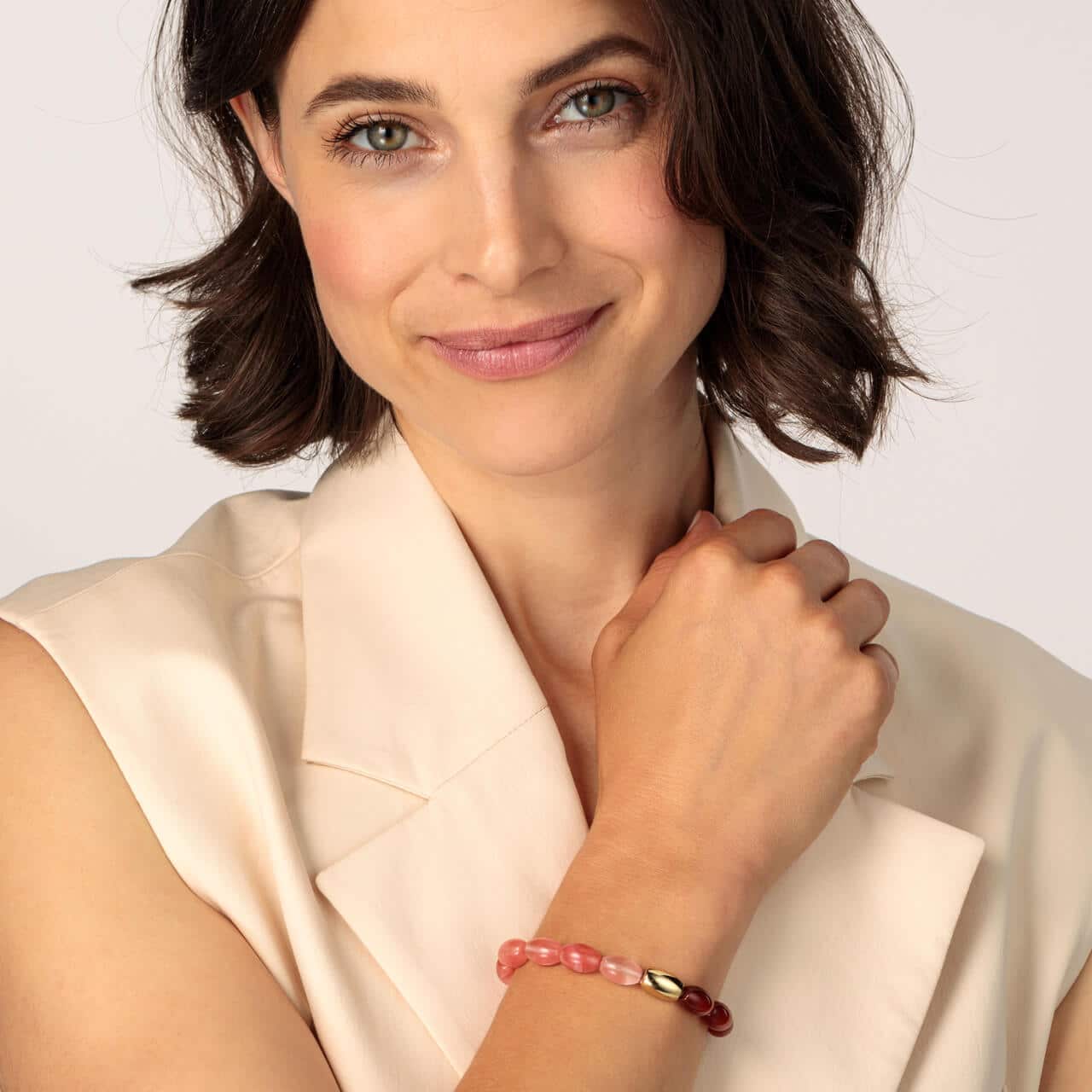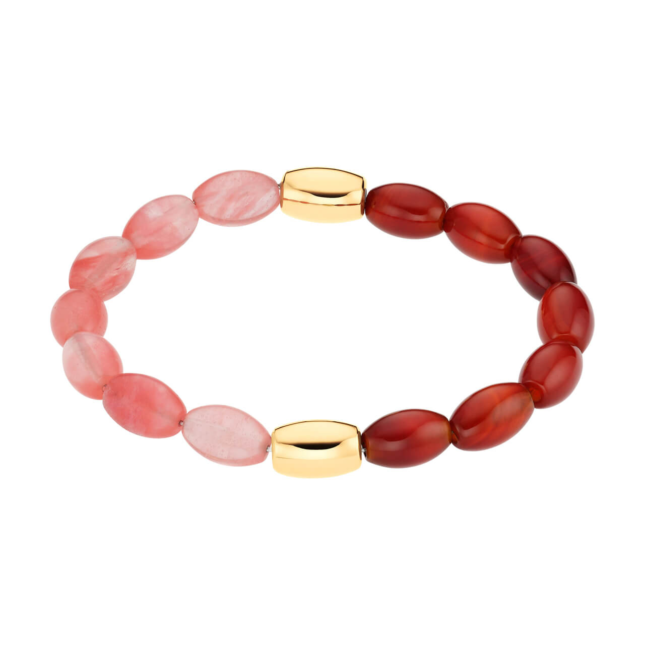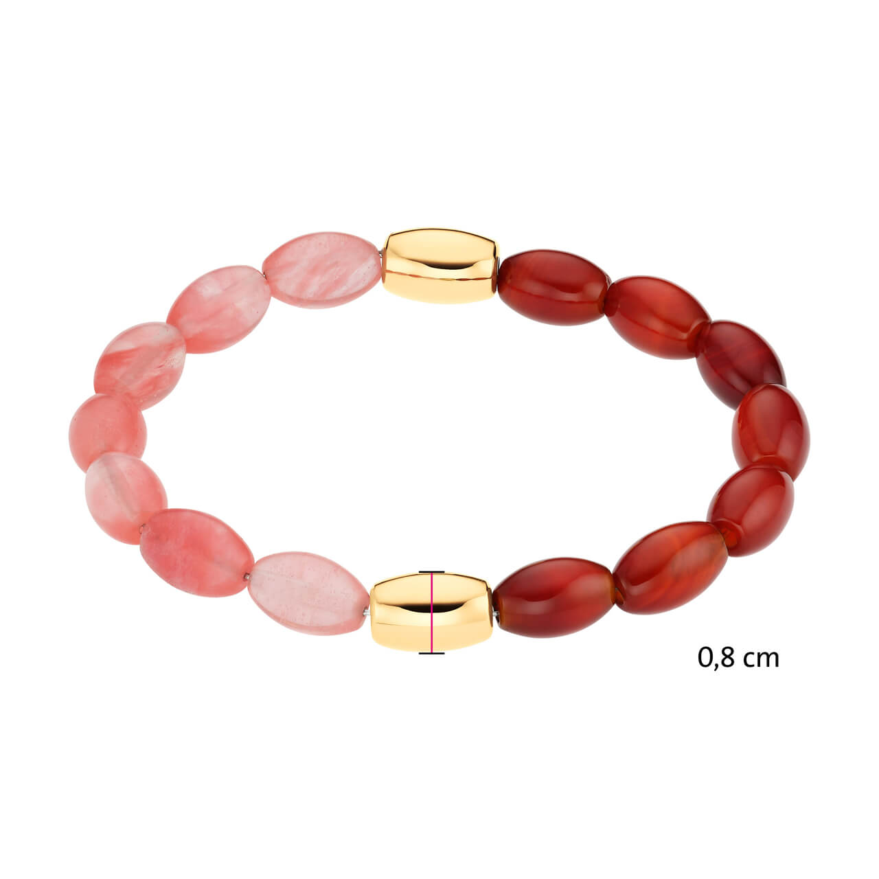 Brățară flexibilă cu pietre semiprețioase din agată roșie, elemente din oțel inoxidabil placate cu aur și mărgele din sticlă roz. Aspectul vesel și estival o transformă într-o piesă atrăgătoare, ușor de combinat cu alte brățări.