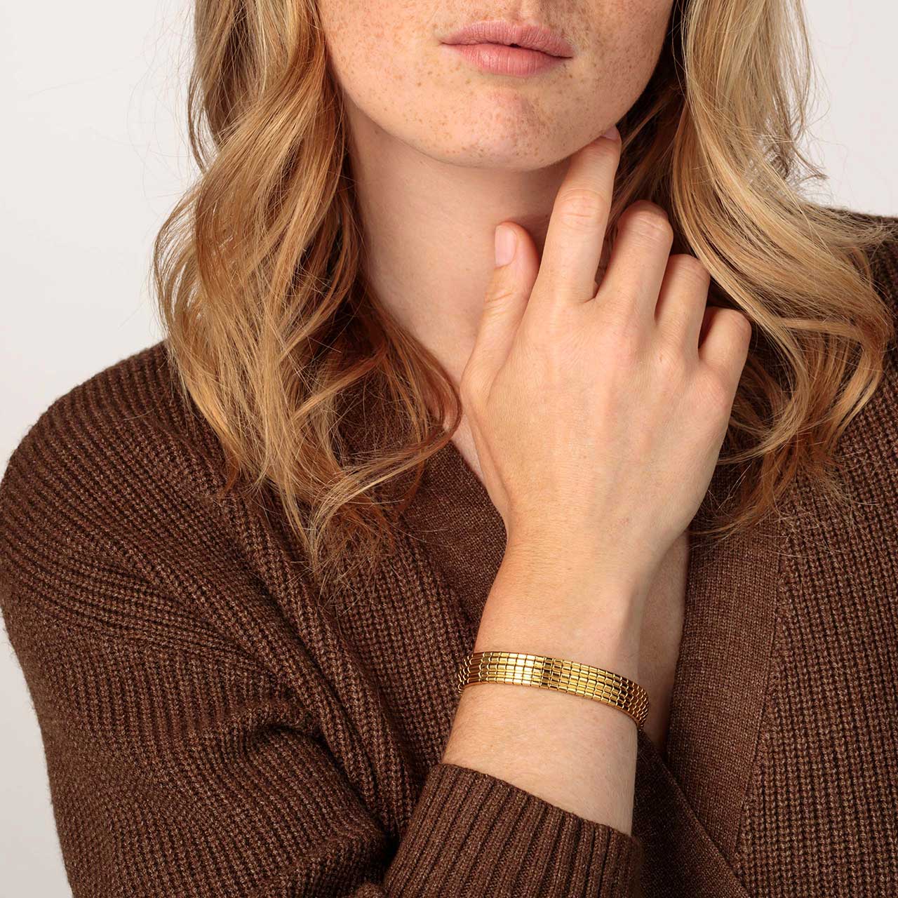 Această brățara flexibilă combină designul atemporal cu confortul plăcut la purtare. Modelul grafic din exterior face din această brățara magnetică o bijuterie modernă de zi cu zi, care poate fi purtată și la ocazii speciale. Pe lângă magneți, această brățară are o incrustație de cupru pe interior. Ideală pentru doamnele care apreciază stilul şi confortul în egală măsură.