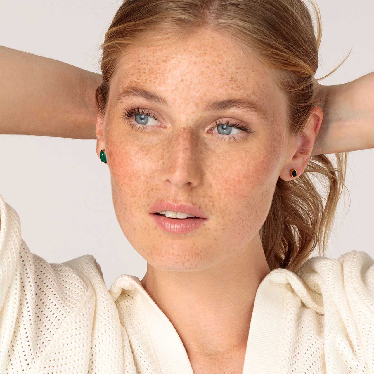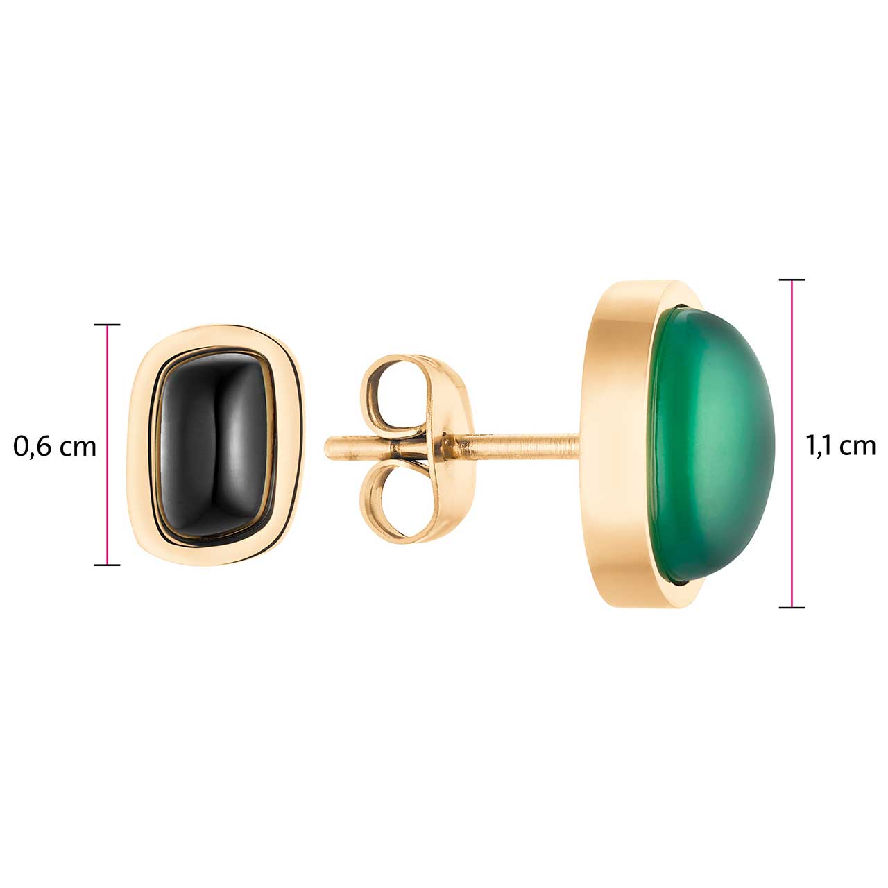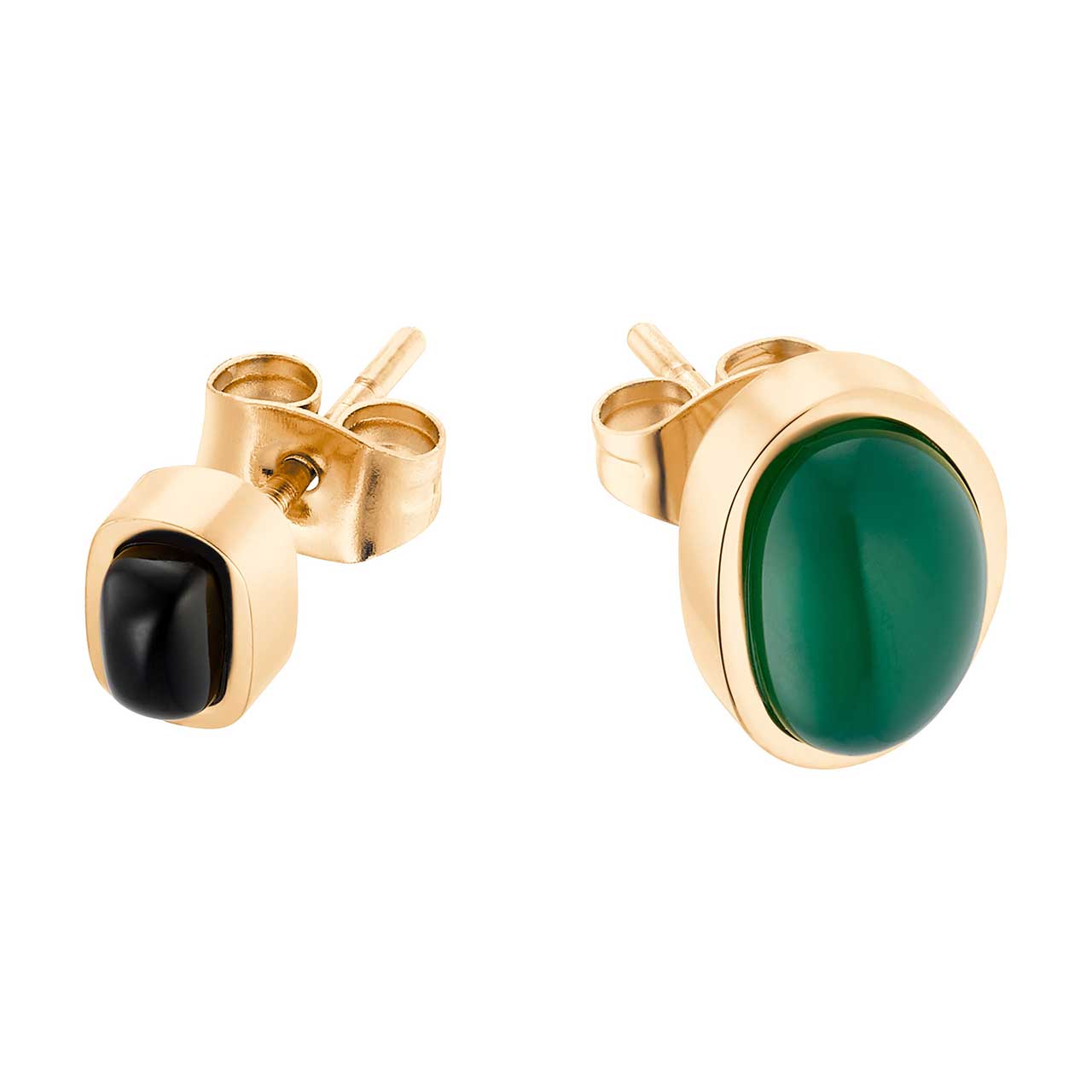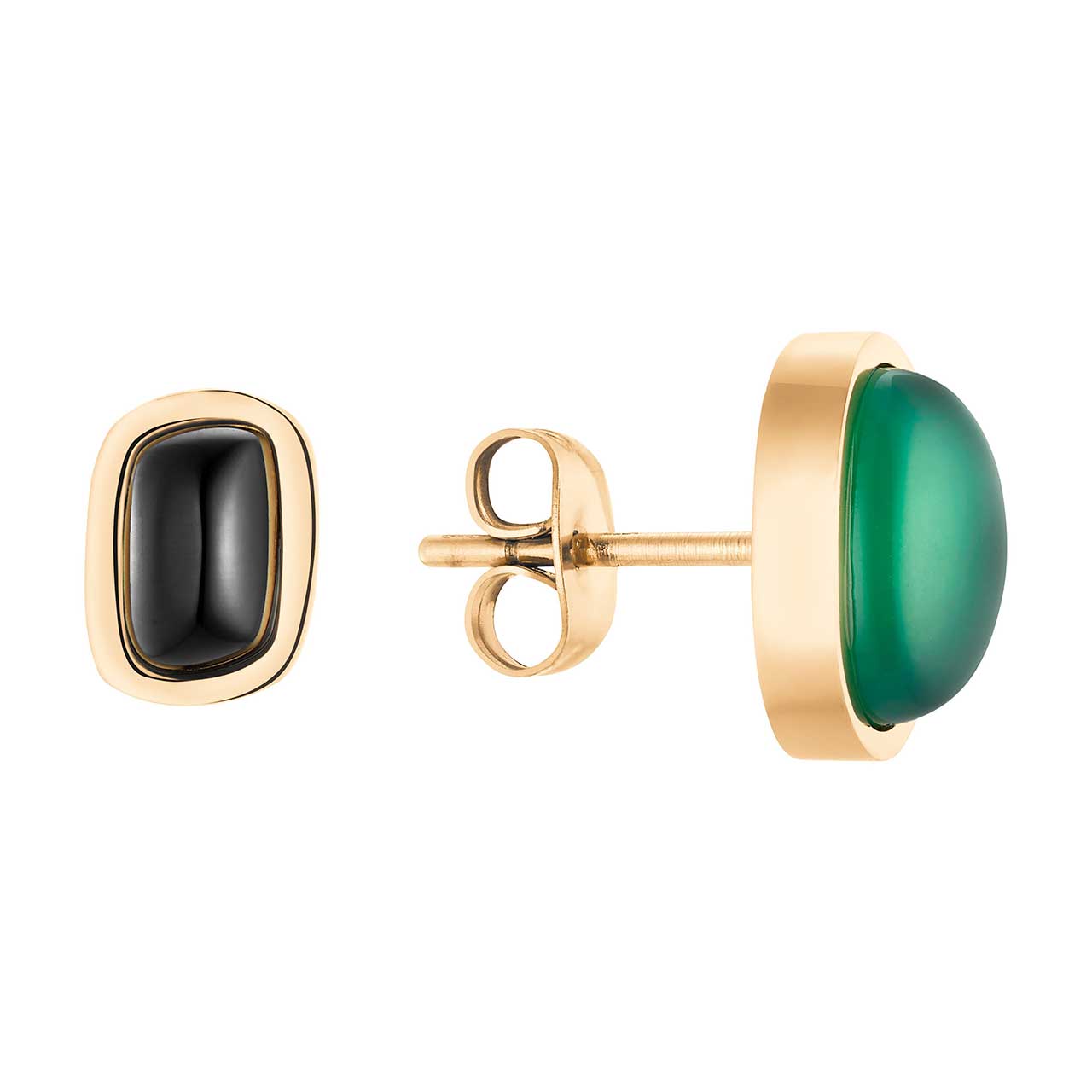 Acest set de cercei tip „Mismatch” placat cu aur este format din două piese de forme și dimensiuni diferite, decorate cu pietre semipreţioase de calcedoniu verde și negru. O combinație elegantă pentru femeile care caută o bijuterie modernă, dar clasică. Tendința de nepotrivire are mulți fani care o găsesc acum și în segmentul bijuteriilor magnetice.