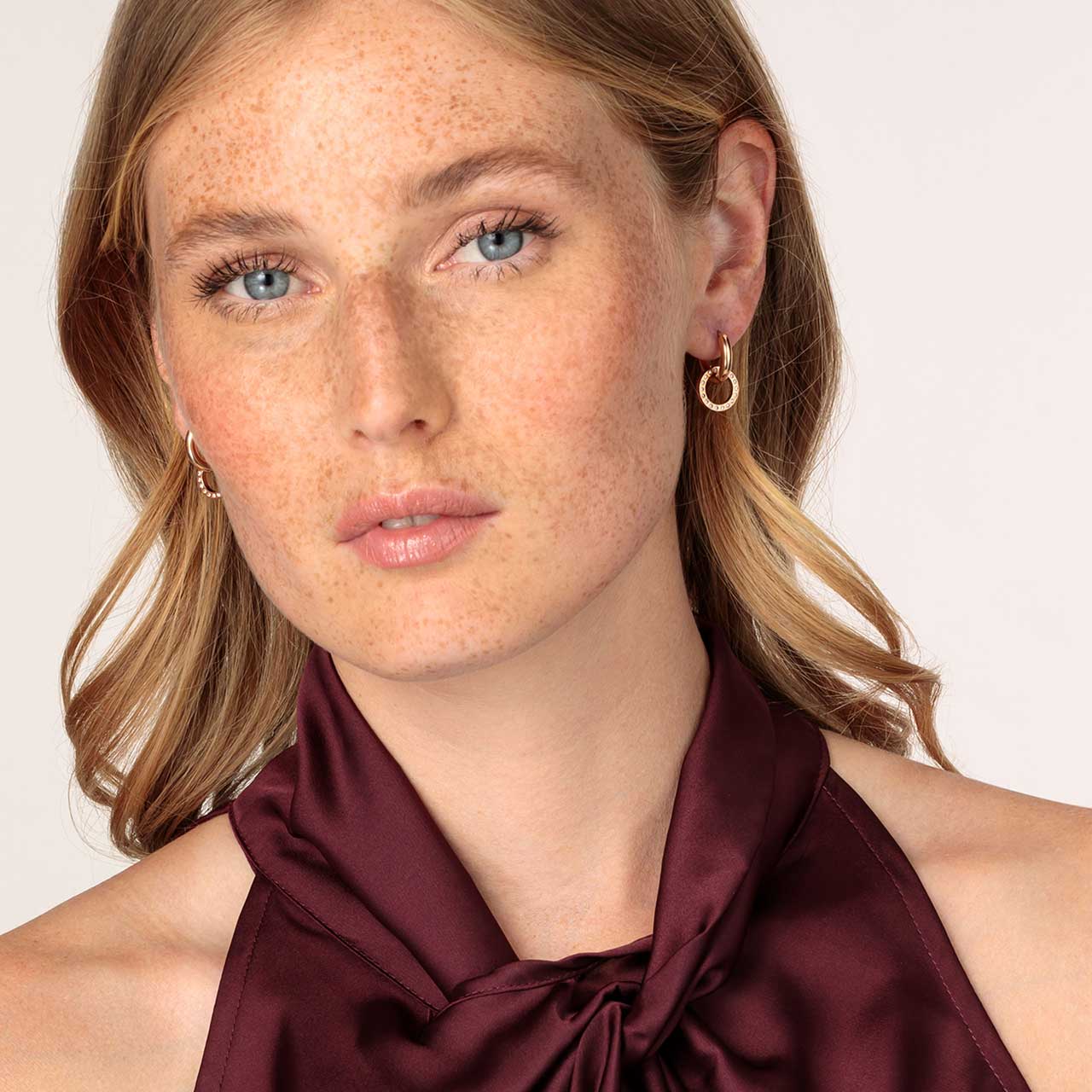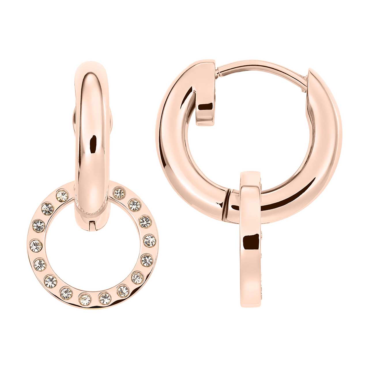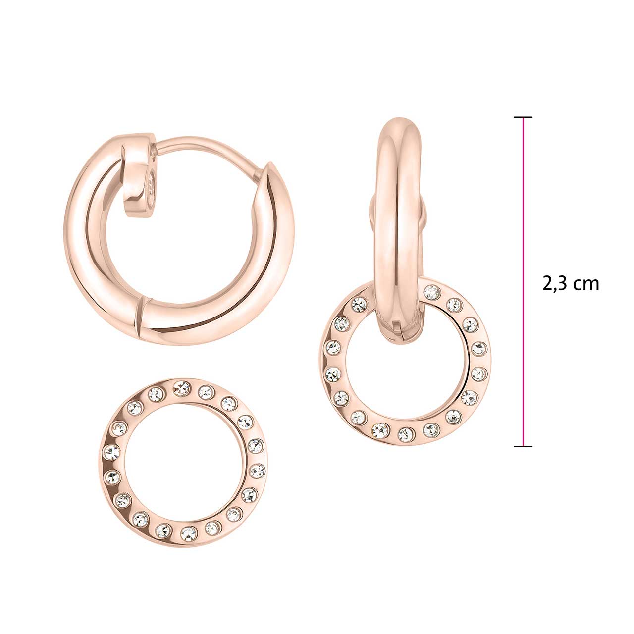 Aceste cercei eleganți, tip creole, placaţi cu aur roz, au fiecare câte un pandantiv rotund cu cristale. Puteți purta cerceii cu sau fără pandantiv. Așadar, aveți o bijuterie pentru tot felul de ocazii – pentru purtare zilnică, precum și pentru evenimente speciale. Cerceii magnetici în sine au o suprafață deosebit de lucioasă care pune foarte bine în valoare cristalele de pe pandantive.