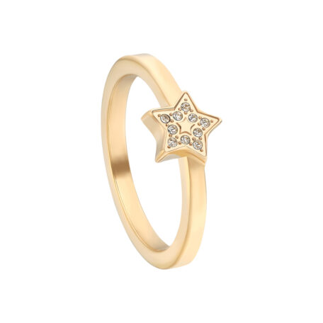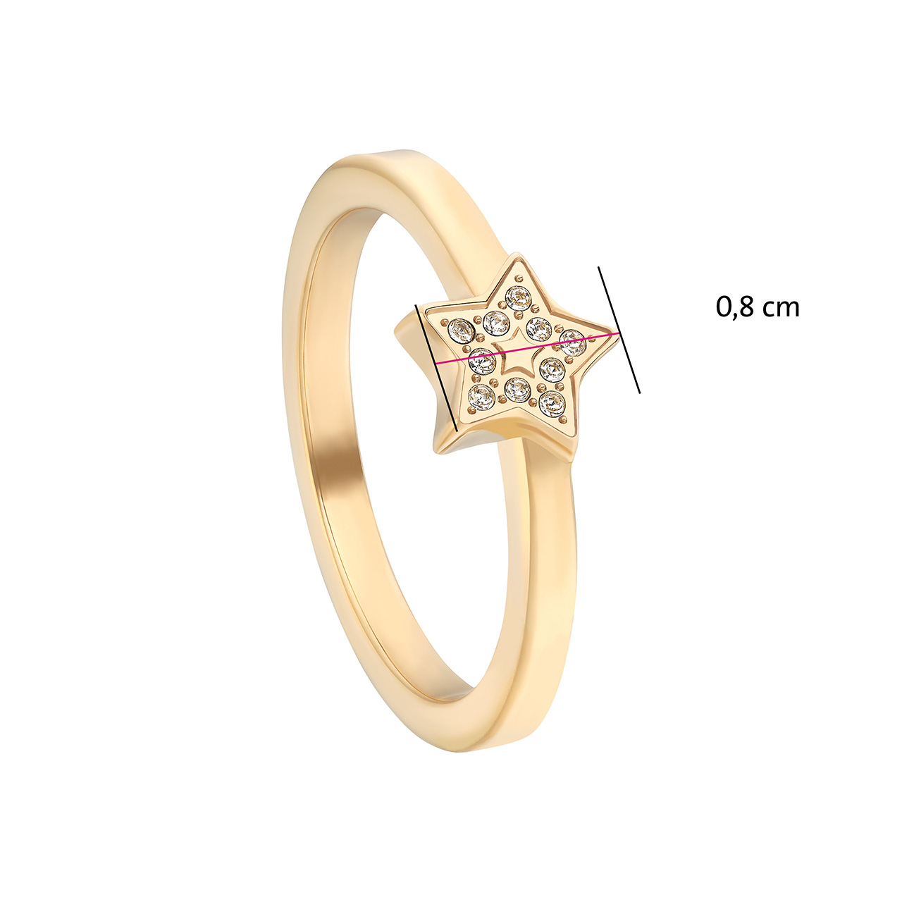 Acest inel placat cu aur, realizat din oțel inoxidabil cu finisaj lucios, se remarcă datorită elemetului central în formă de stea, decorat cu mici cristale strălucitoare. Inelul are un design foarte modern, cu magneți încorporați, care poate fi bine combinat cu alte bijuterii – de exemplu, cu o brățară asortată.