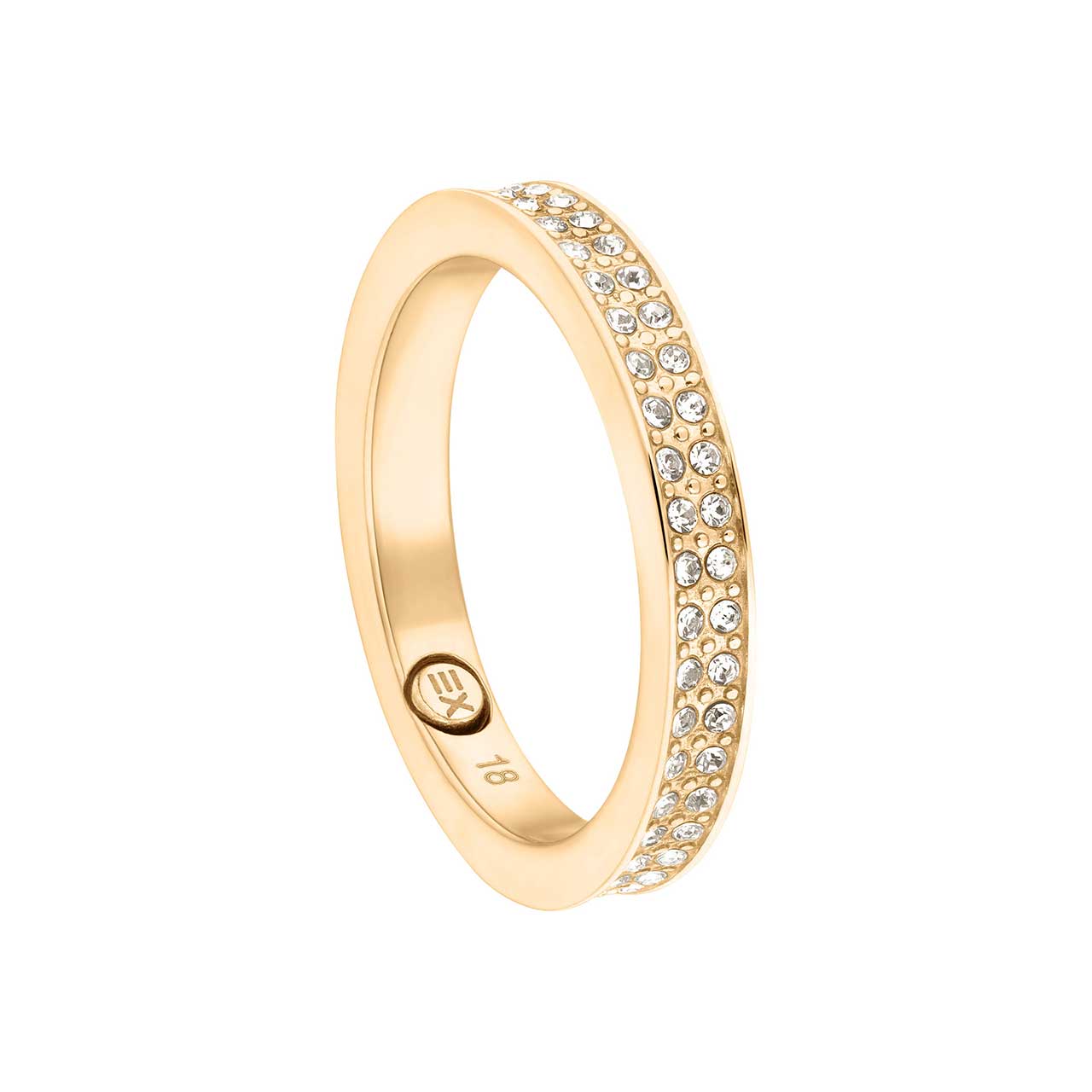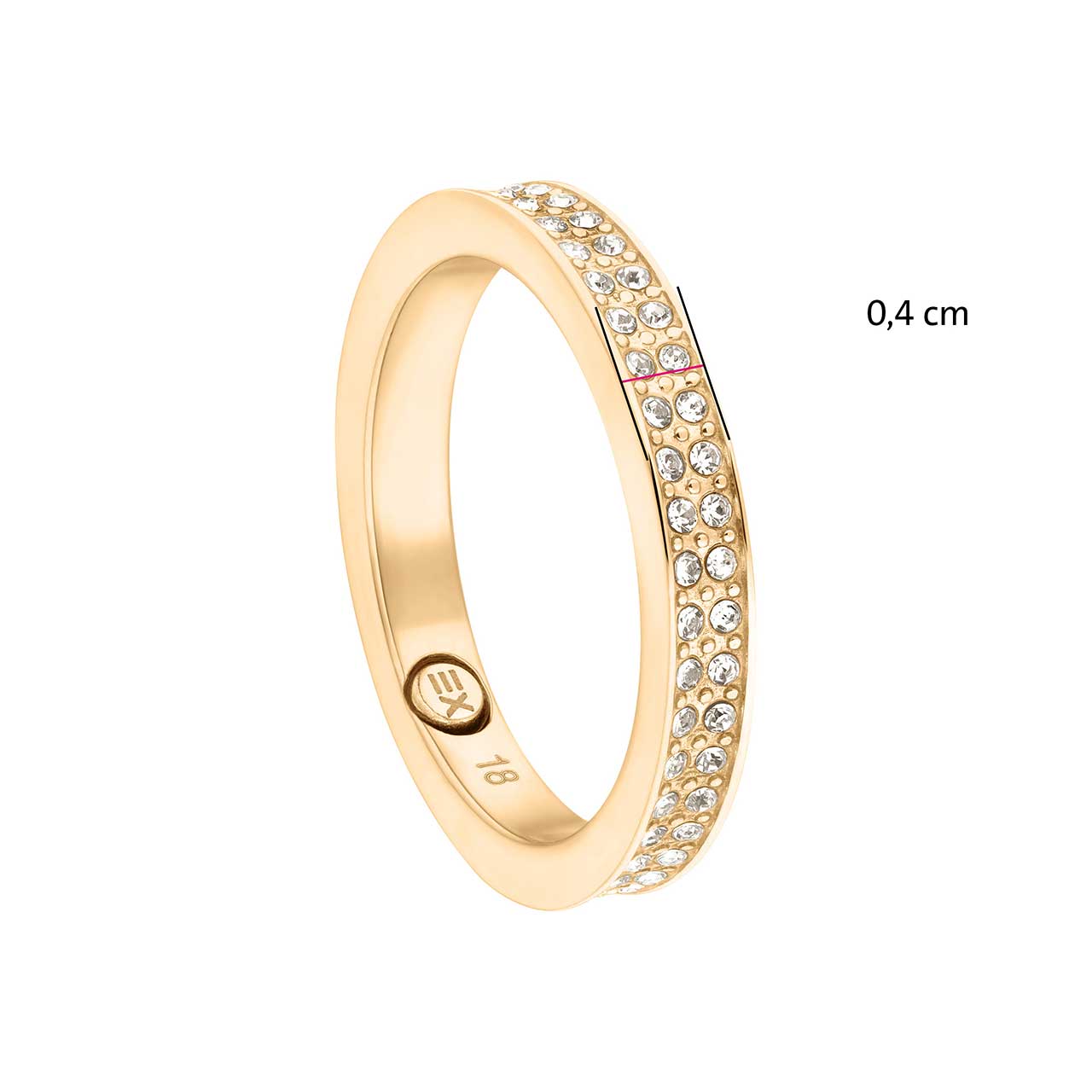 Acest inel subțire, placat cu aur, convinge prin designul său clasic, care este în același timp minimalist şi modern. Inelul este realizat din oțel inoxidabil cu finisaj lucios și este încrustat cu două rânduri de mici cristale strălucitoare. Această bijuterie este foarte versatilă, ceea ce înseamnă că poate fi mereu combinată cu o varietate de ținute și alte bijuterii.