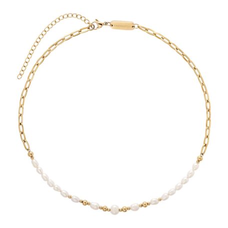 Lanțul placat cu aur al acestui colier formează un contrast frumos cu mărgelele fine de apă dulce. Colierul cu putere magnetică se caracterizează printr-un design foarte modern pe care poți să-l interpretezi întotdeauna într-un mod nou – uneori sportiv, alteori elegant.