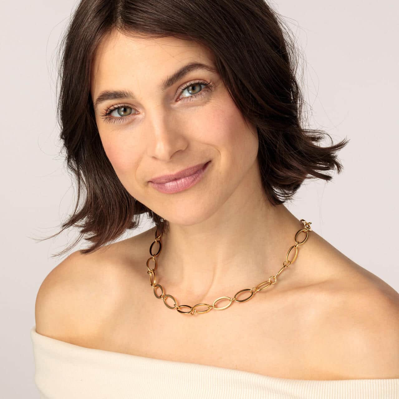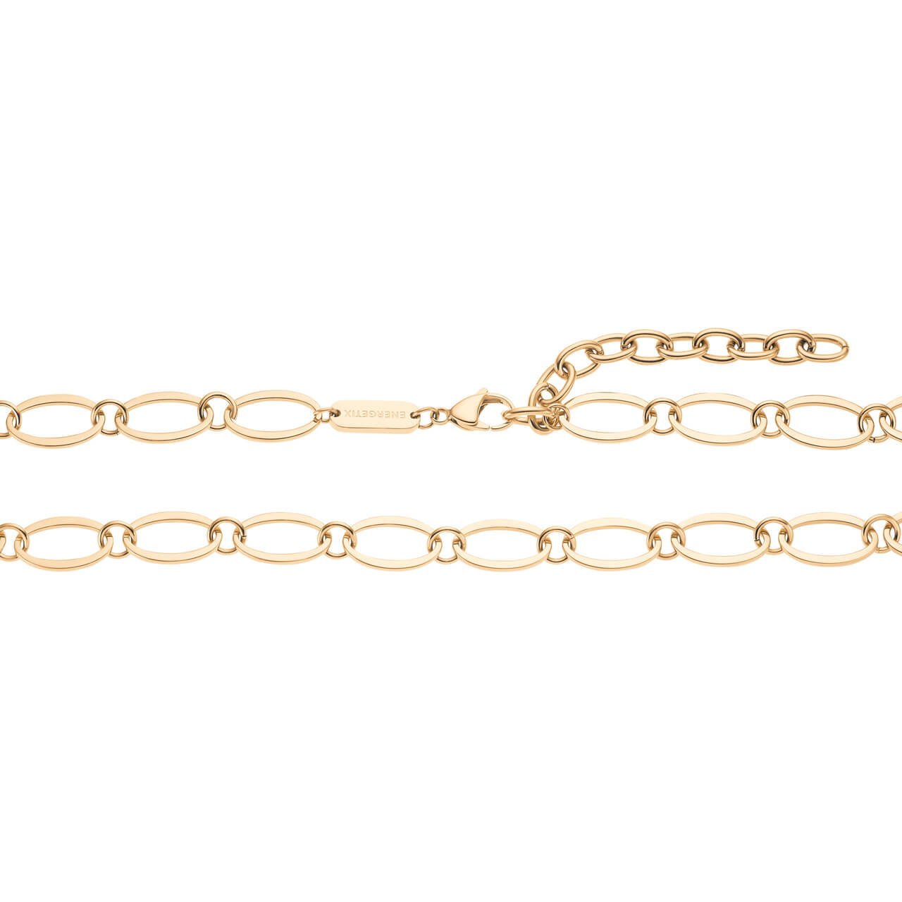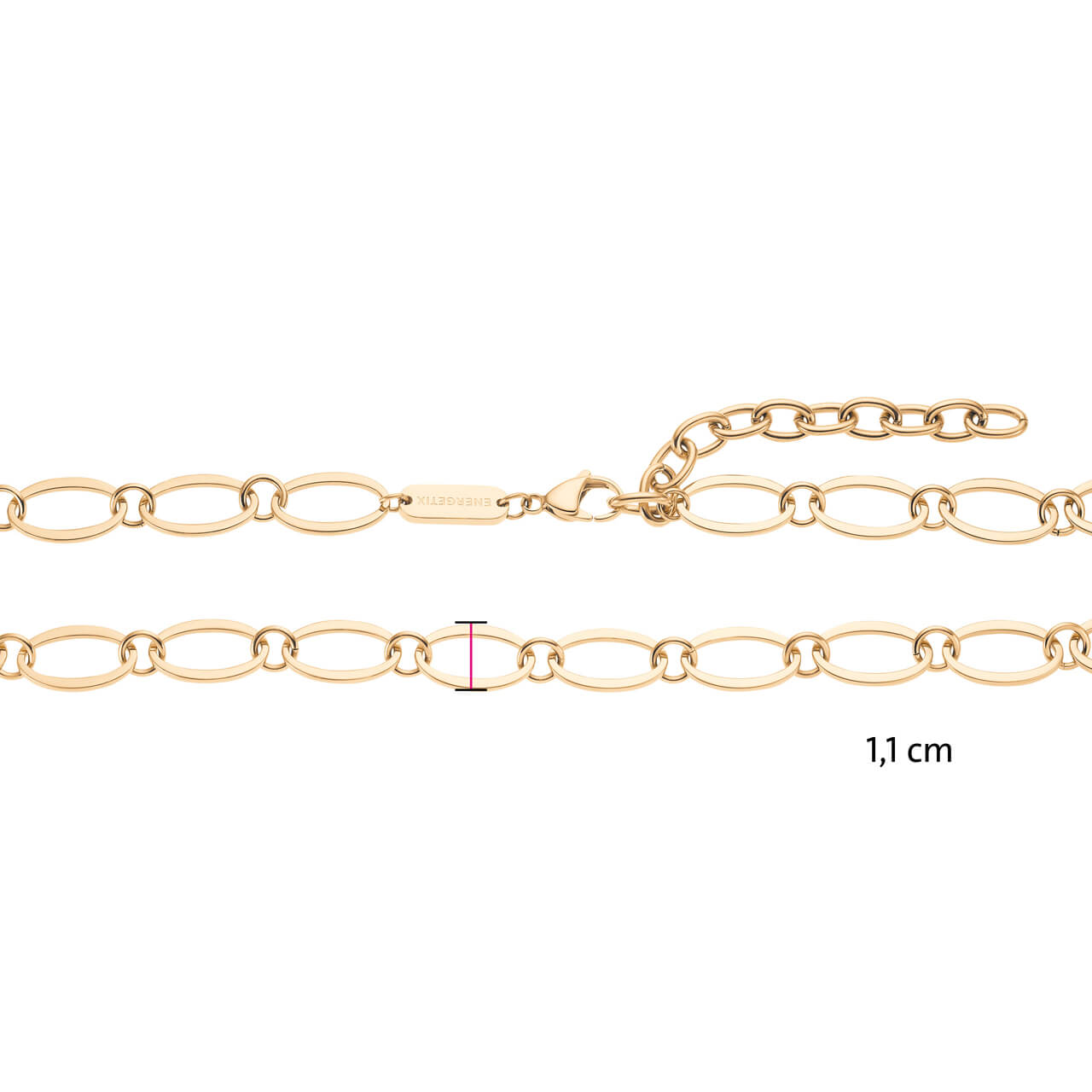Colier modern, masiv, cu o combinație de zale mari și mici, care creează un aspect foarte la modă. Lanțul de extensie permite ajustarea individuală a dimensiunii.