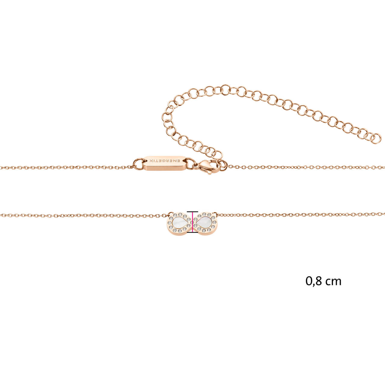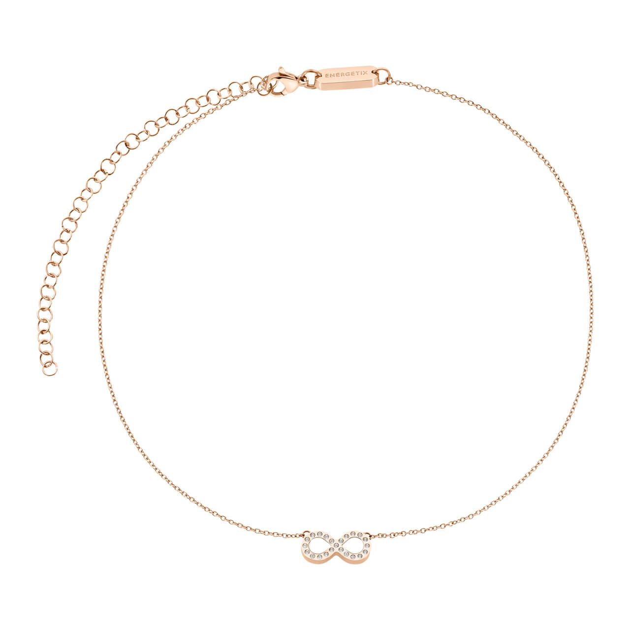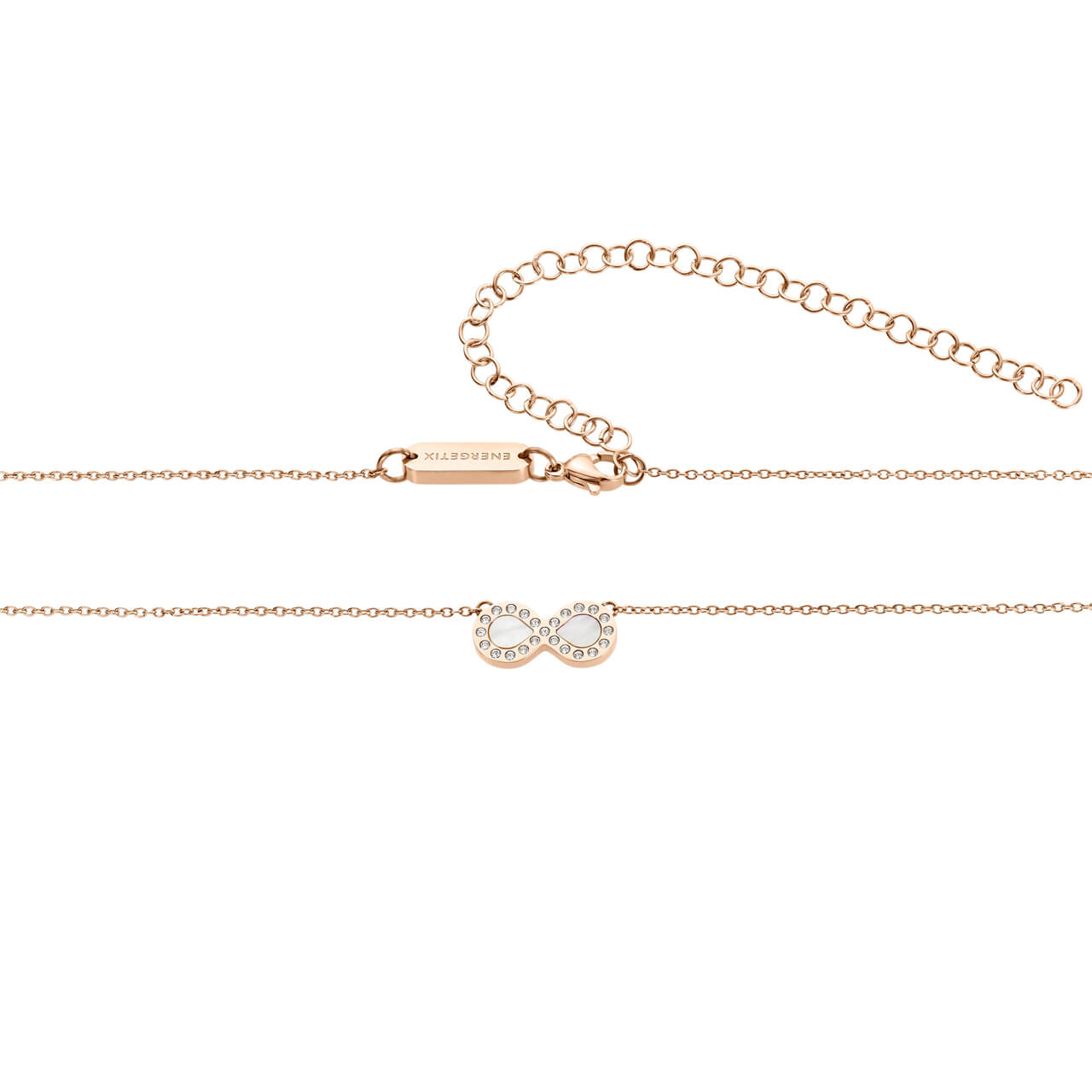 Un colier magnetic în nuanță roz, cu simboluri infinit realizate din sidef fin, așezate armonios de-a lungul gâtului. Această bijuterie delicată emană un farmec feminin și o stare de armonie, îmbinând un design jucăuș cu eleganță feminină. Un simbol puternic al infinitului, ideal ca dar sau talisman norocos.