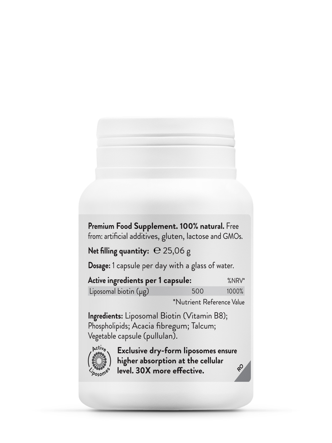 Biotina, cunoscută și sub numele de Vit. B7 sau „vitamina frumuseții,” este o vitamină hidrosolubilă din complexul B, esențială pentru sănătatea pielii, părului, unghiilor și metabolismului energetic. Nu poate fi stocată în organism, deci trebuie obținută zilnic prin alimentație sau suplimente. Biotina susține creșterea și regenerarea celulelor, contribuind direct la sănătatea pielii, părului și unghiilor. La nivelul pielii, ajută la menținerea unei bariere protectoare sănătoase, reducând uscăciunea și promovând un aspect neted și strălucitor. Biotina joacă un rol esențial în producerea de keratină, o proteină structurală importantă, care întărește firul de păr și sprijină creșterea acestuia. Ajută la creșterea și întărirea unghiilor, prevenind ruperea și exfolierea. Astfel este recunoscută ca un ingredient cheie pentru susținerea unui aspect sănătos și vibrant.