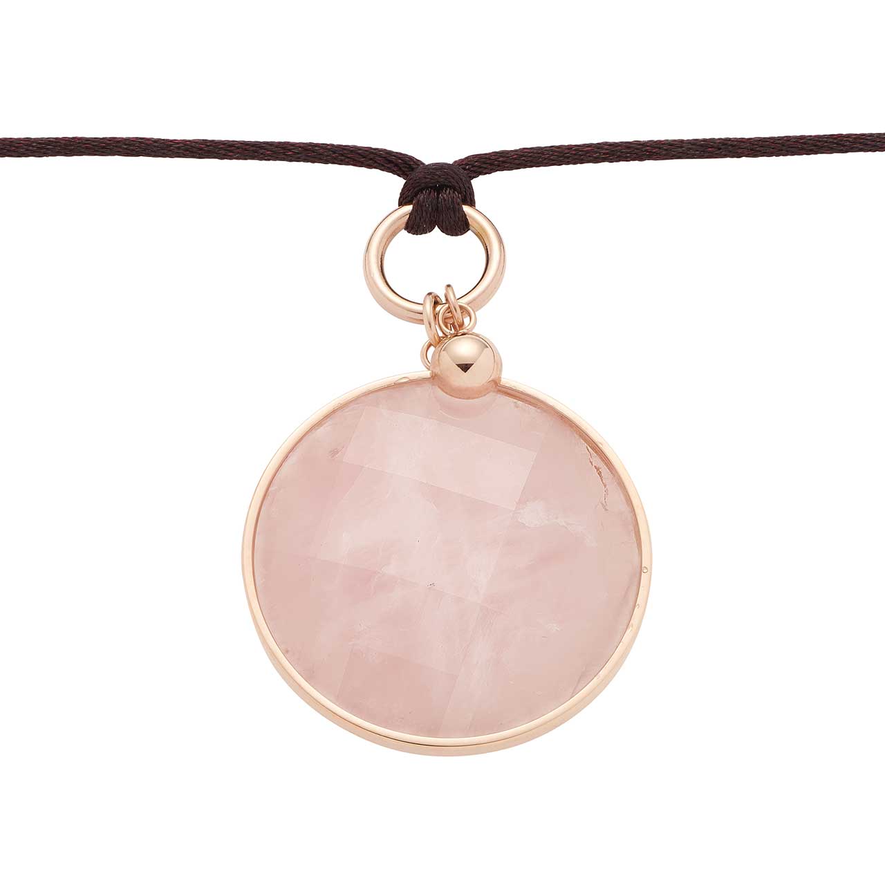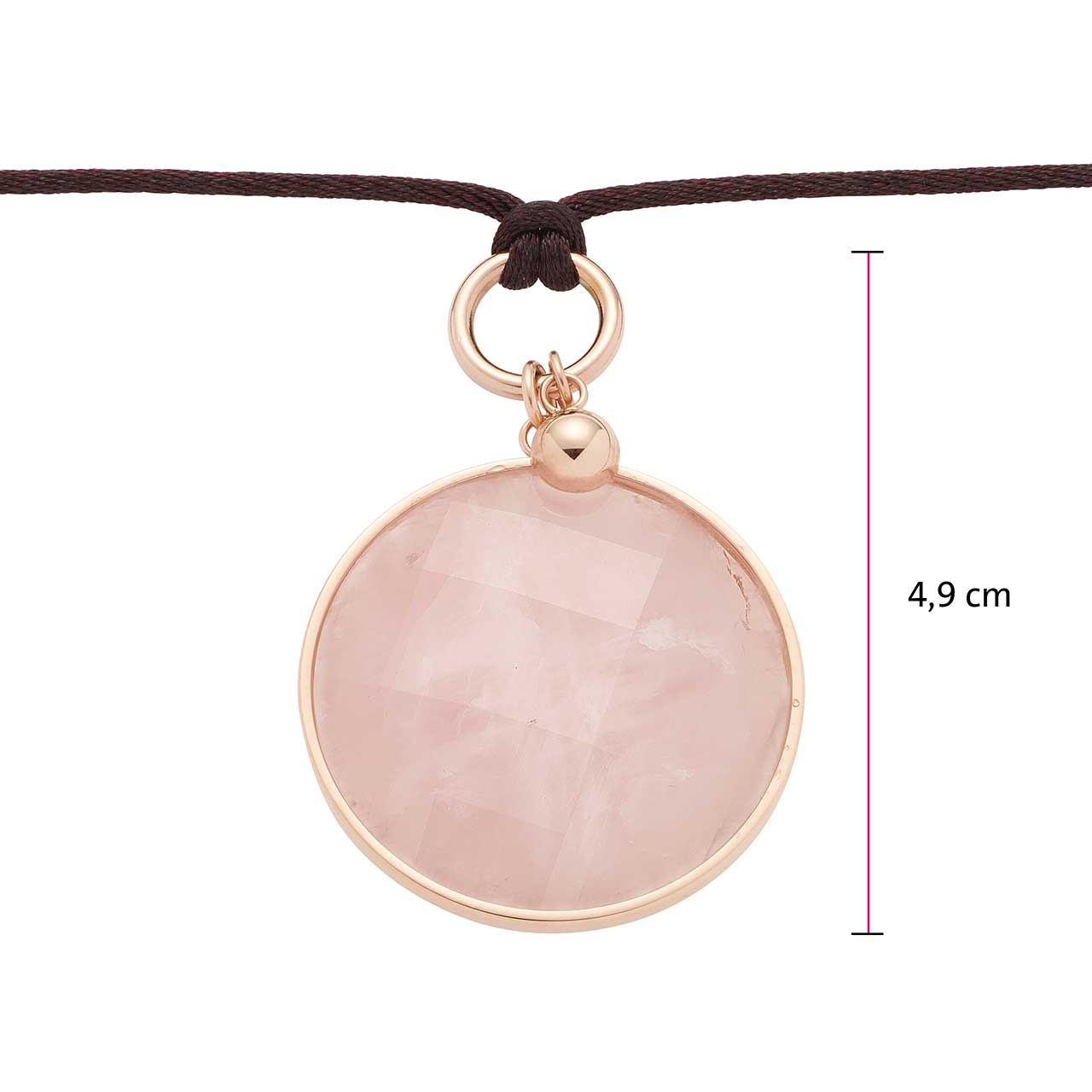Acest pandantiv reprezintă o piatră semipreţioasă de mari dimensiuni din cuarţ roz, fațetată pe ambele părți, încadrată într-un cadru din oţel inoxidabil placat cu aur roz. Vine cu un cordon de mătase maro, care se potrivește perfect – pandantivul poate fi purtat, desigur, și cu un lanț la alegere.