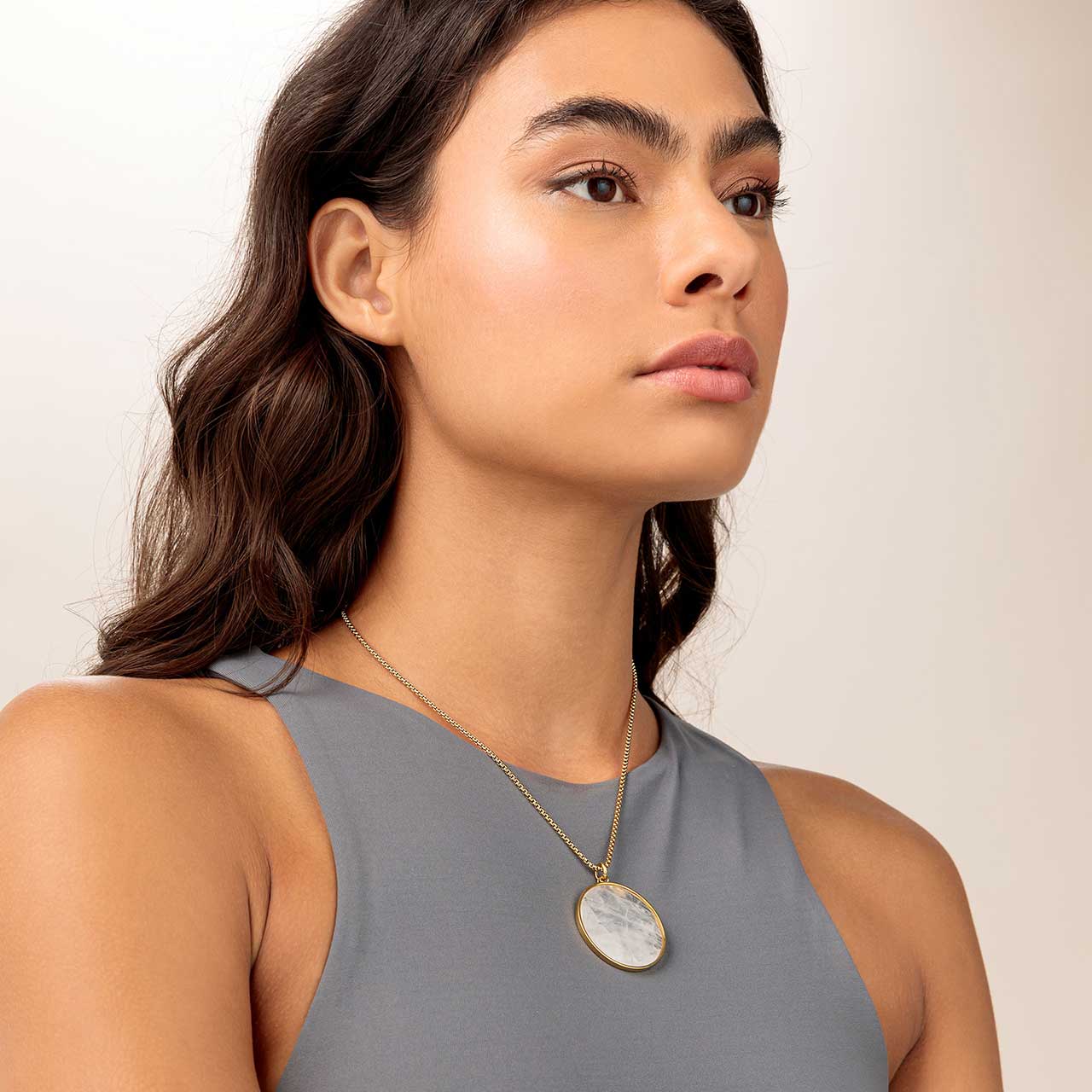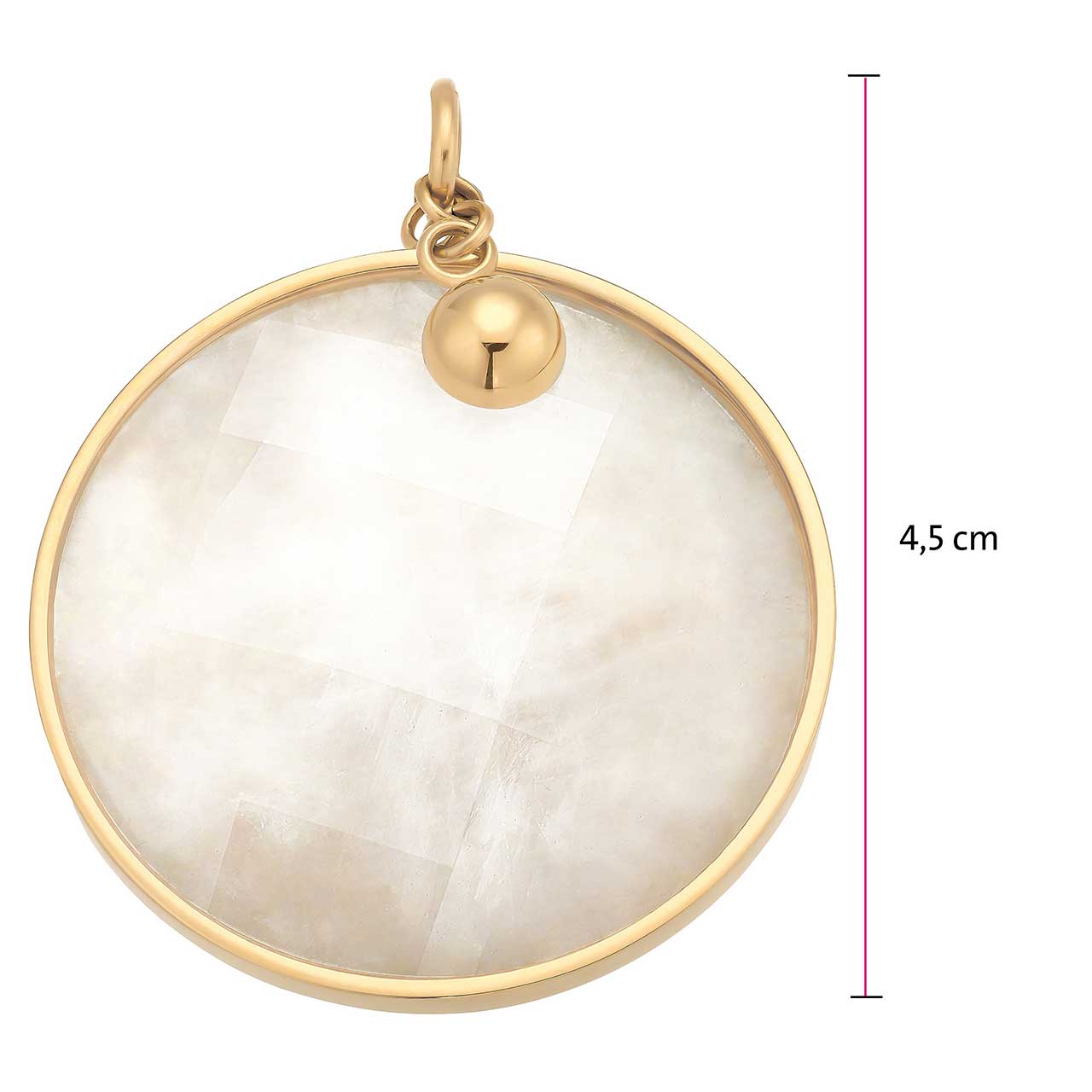 Acest pandantiv se compune dintr-un cristal de stâncă, de mari dimensiuni, cu fațete pe ambele părți și încadrat într-un suport din oţel inoxidabil, placat cu aur. Cristalul este natural, ceea ce înseamnă că fiecare piatră este unică! Este ușor translucid și impresionează printr-un joc de culori deosebit de armonios.