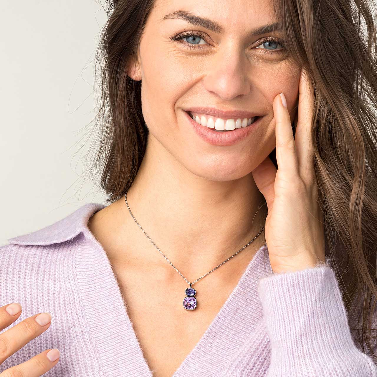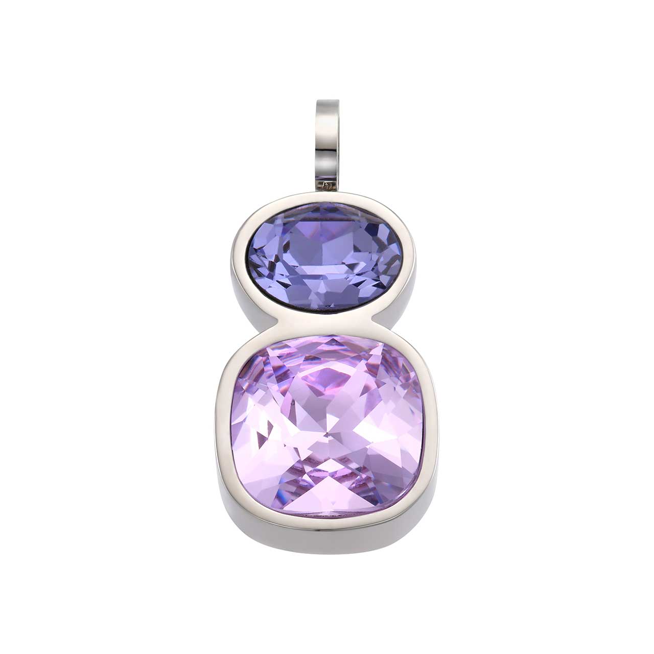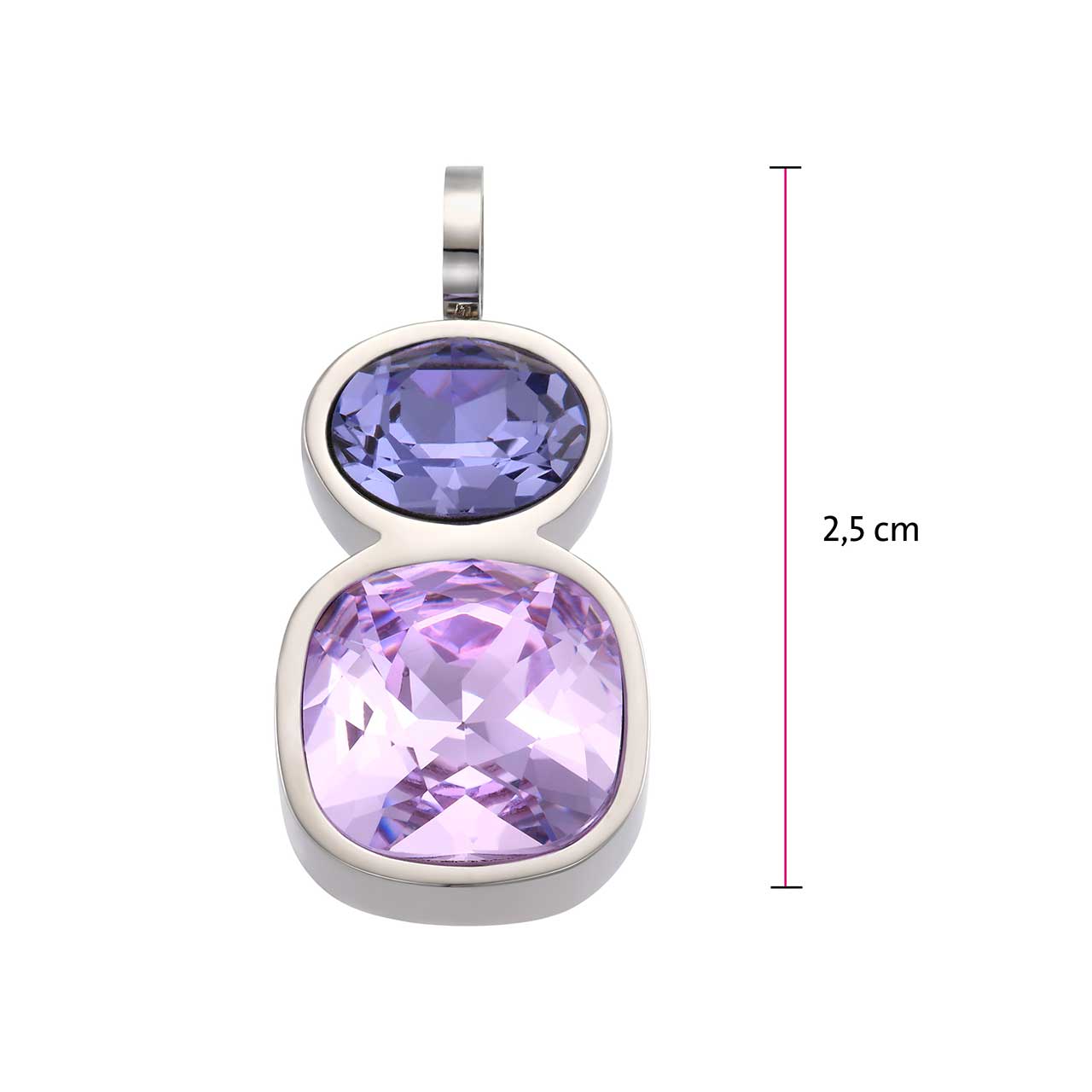 Acest pandantiv magnetic modern este caracterizat de designul său minimalist, care deschide o varietate de opțiuni de combinare cu alte accesorii. Două cristale mari în diferite nuanțe de mov, care emit o strălucire minunată, se află în centrul acestei piese care va face orice decolteu să strălucească.