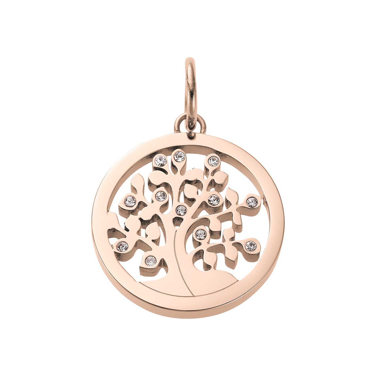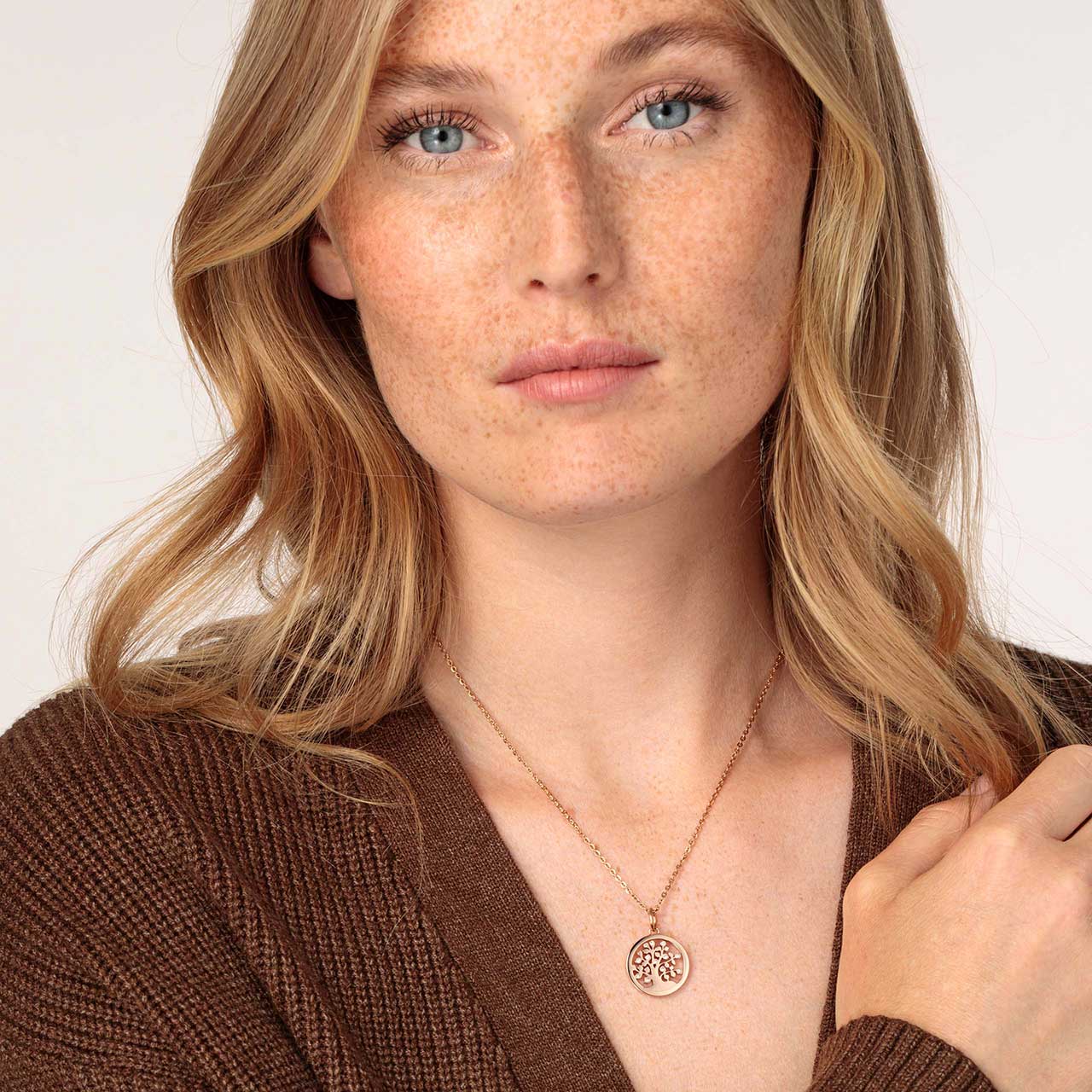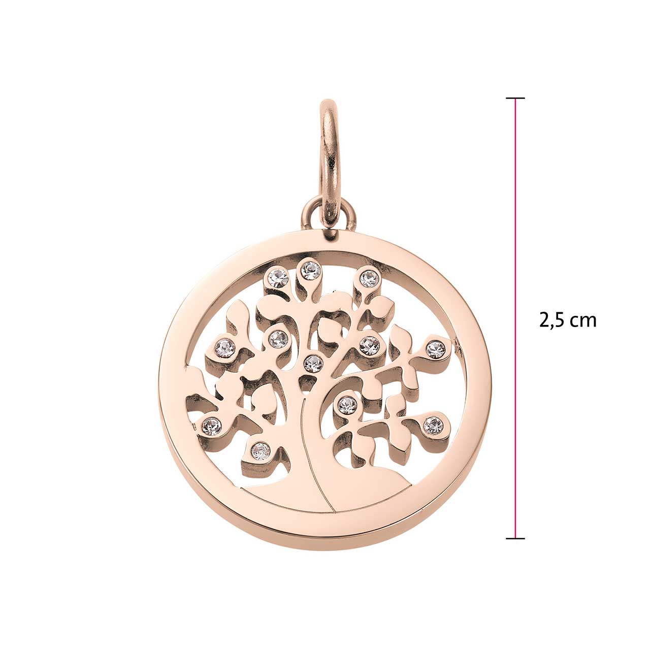 Simbolul arborelui vieții reprezintă forța interioară și echilibrul, ceea ce face din acest pandantiv placat cu aur roz un companion foarte special în viața de zi cu zi. Această bijuterie este de asemenea potrivită ca dar pentru cineva drag. Pandantivul este fabricat din oțel inoxidabil cu finisaj lucios și este decorat cu mici cristale care emană o strălucire delicată.
