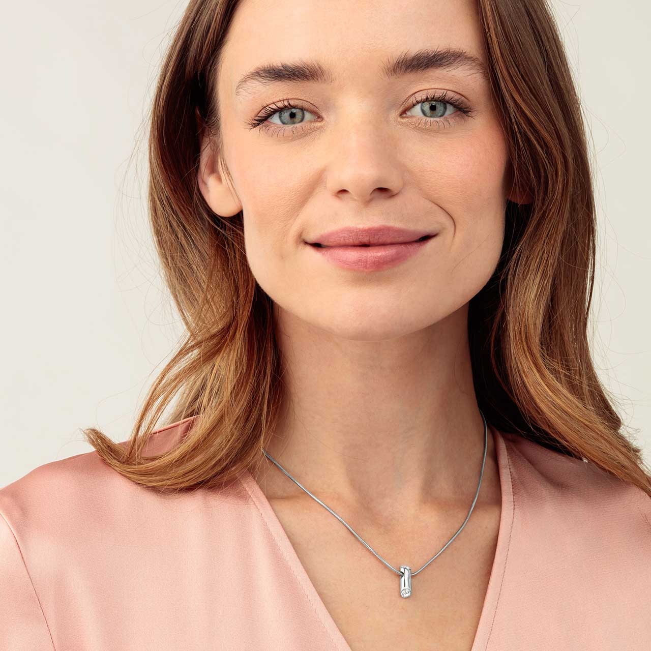 Lucrul special la acest pandantiv este designul său modern și minimalist. Cu toate acestea, este cu de-a dreptul captivant, nu în ultimul rând datorită celor două cristale strălucitoare care sunt plasate în partea de sus și de jos a bijuteriei. Sfat: Dacă purtați pandantivul aproape de gât, acesta va ieși în evidență în mod deosebit. În mod alternativ, puteți, desigur, să-l combinați și cu un lant mai lung.