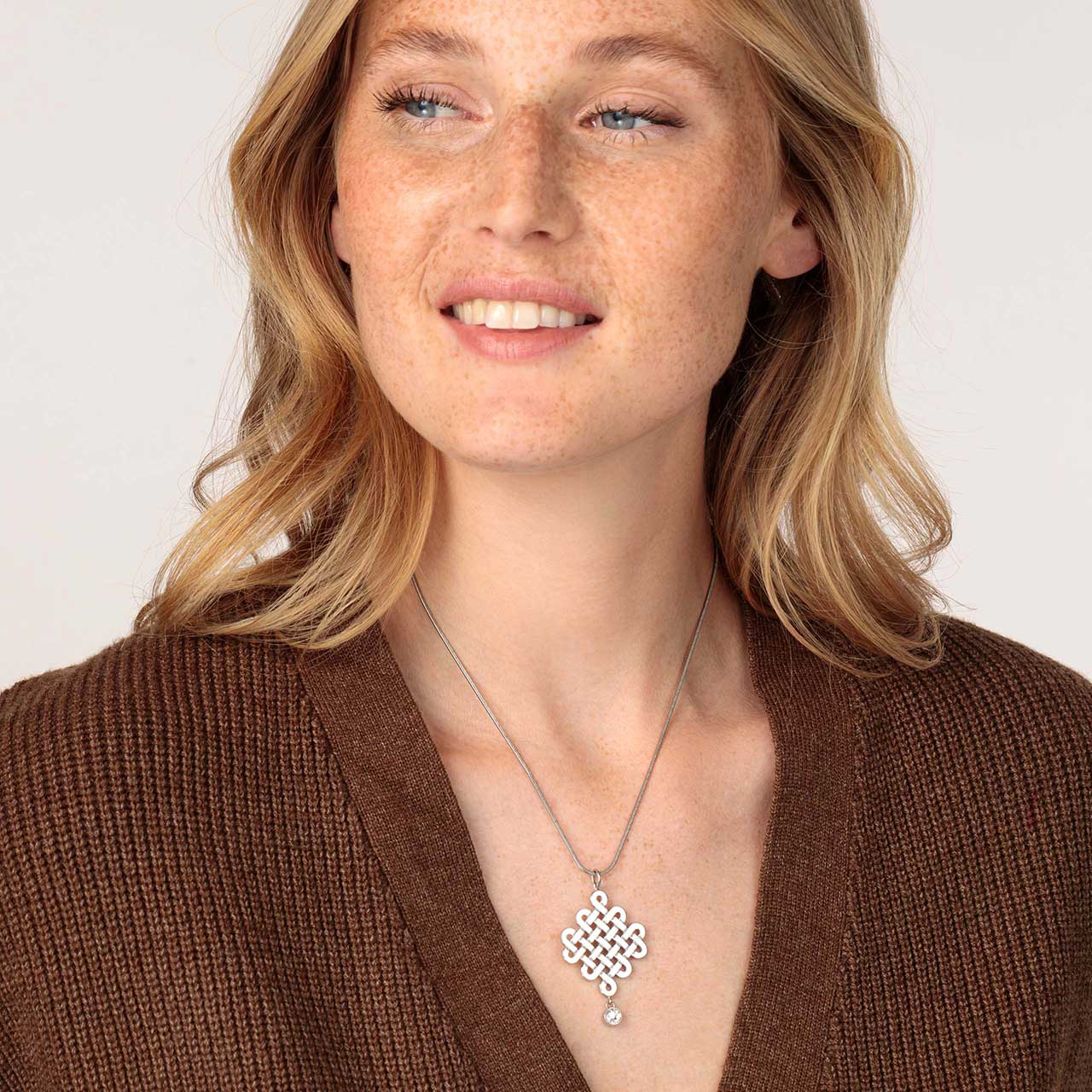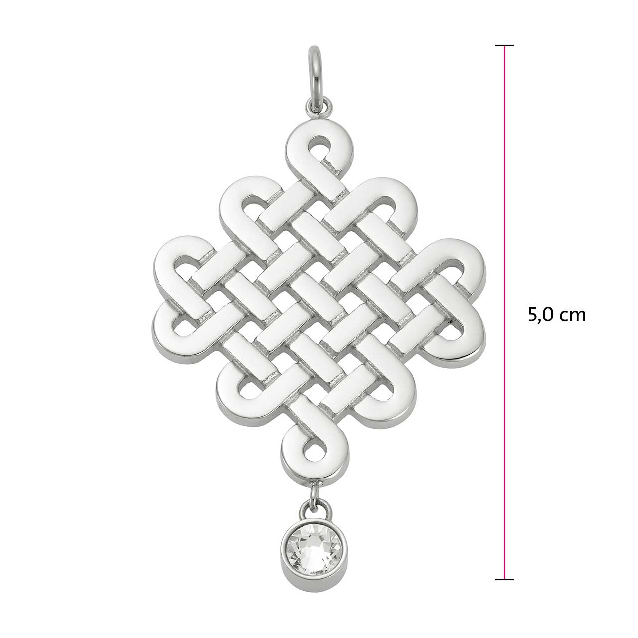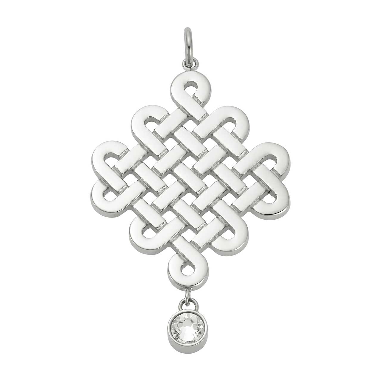 Un pandantiv de mari dimensiuni, din oțel inoxidabil cu finisaj lucios, care dispune de un mic cristal și un model detaliat sub formă de nod. La o privire mai atentă, modelul sa dezvăluie inimi mici, împletite, care simbolizează conexiunea, dragostea și fericirea. O bijuterie specială pentru femei, care atrage atât din punct de vedere vizual, cât și emoțional. Ideal ca şi accesoriu statement / declarativ sau ca un cadou care are un sens mai profund.