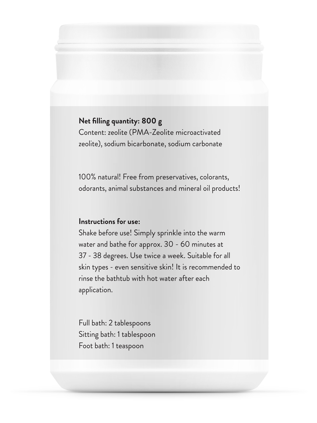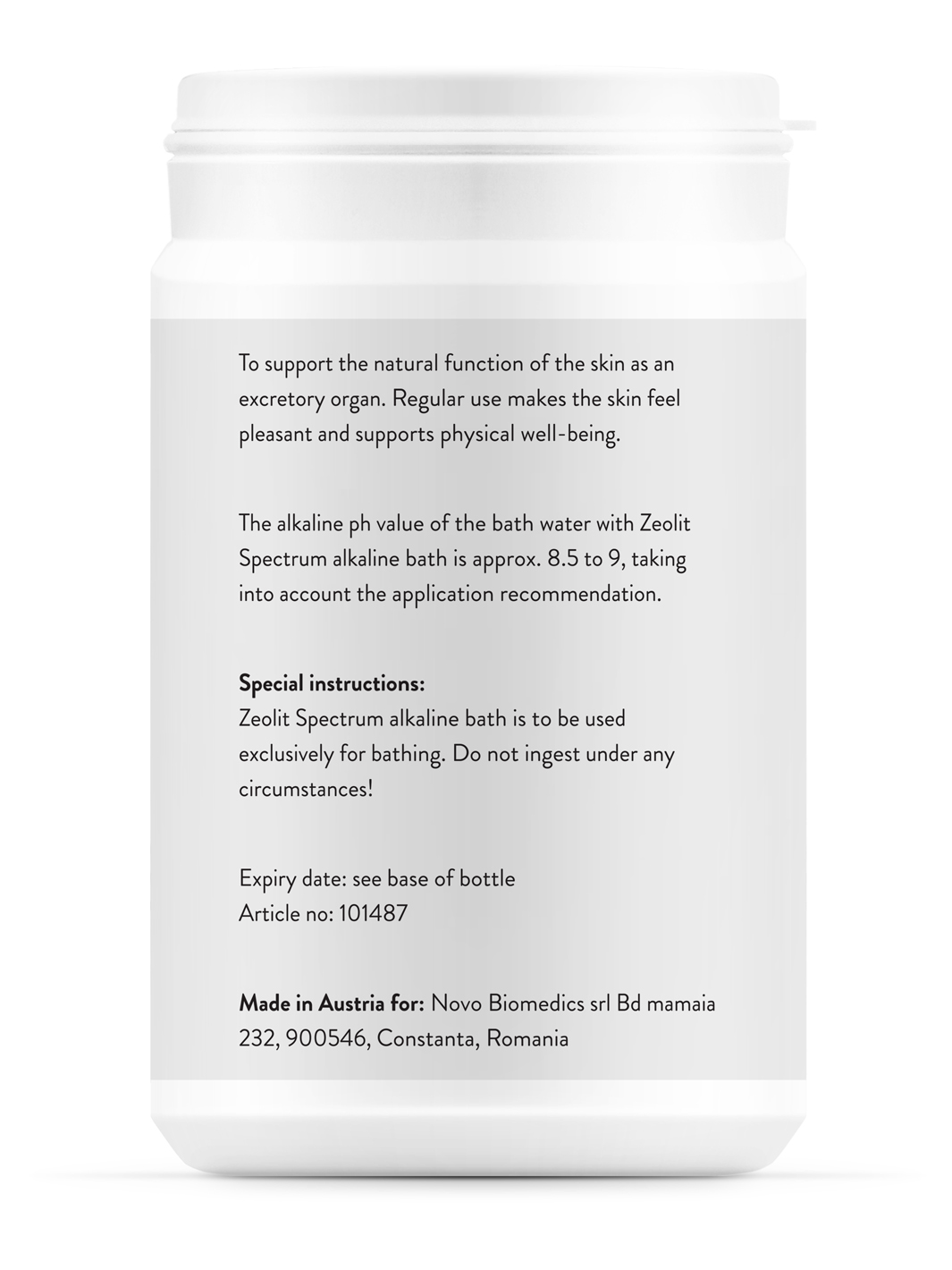 Un detoxifiant excelent pentru piele, sarea alcalină cu zeolit reactivează funcția naturală de protecție, hrănește și regenerează pielea, susținând rolul acesteia ca organ excretor. Este potrivită pentru băi de picioare, băi de șezut sau băi complete. Baia alcalină relaxează și armonizează echilibrul acido-bazic, contracarând hiperaciditatea cu multiple beneficii pentru sănătate. Folosită regulat, reprezintă un remediu eficient pentru toate vârstele, fiind benefică și în cadrul unei diete. Calmează, relaxează, reduce stresul și poate fi utilizată zilnic datorită efectului său plăcut.